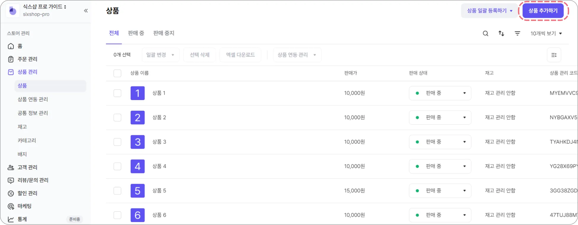 Step 1. [식스샵 프로 > 상품 관리 > 상품]에서 오른쪽 상단 상품 추가하기를 클릭해 주세요.