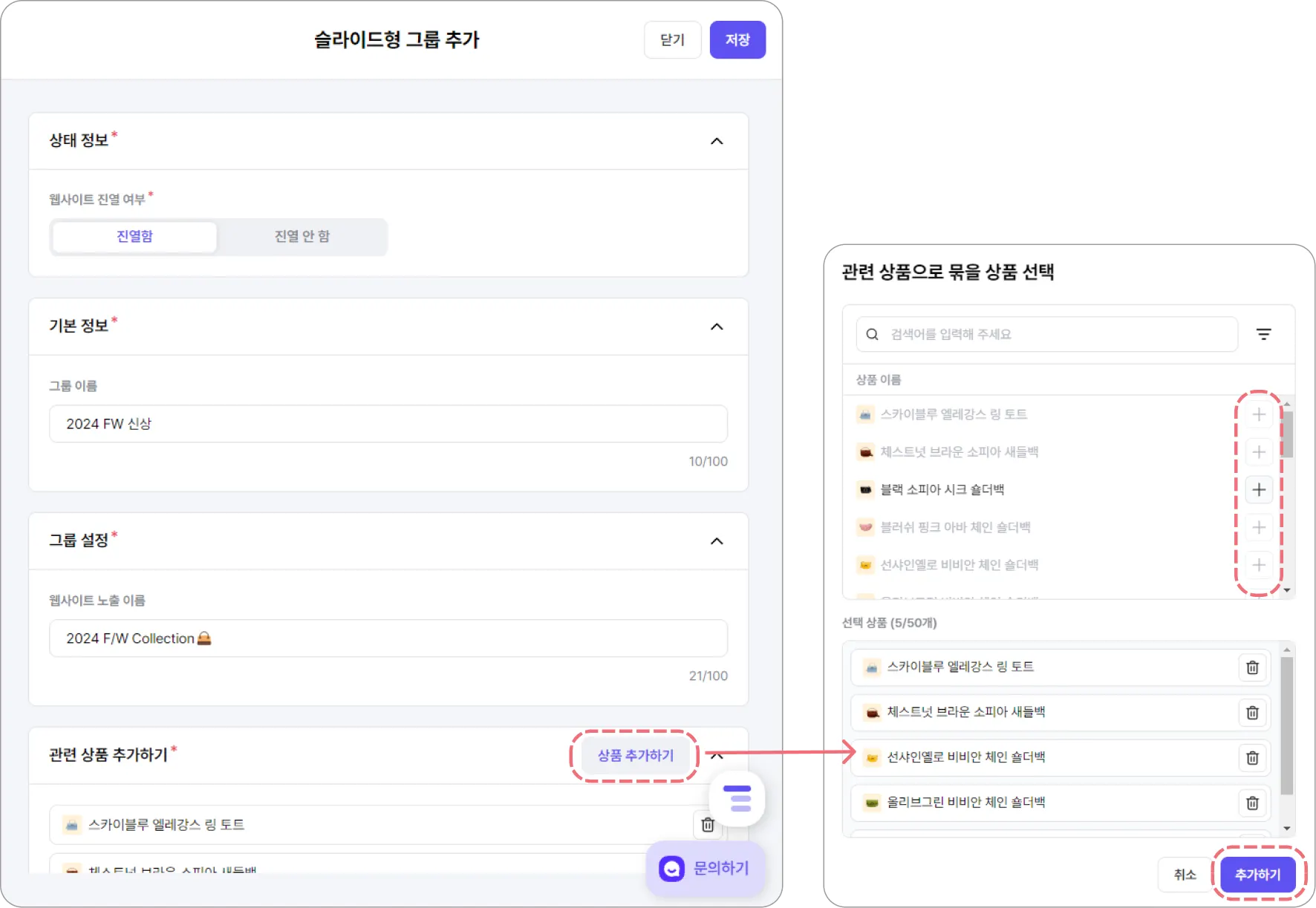 Step 3. 나타나는 그룹 추가 패널에서 관련 상품 그룹 생성에 필요한 정보를 입력해 주세요.