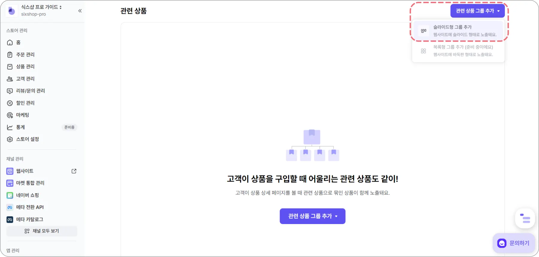 Step 2. 추가된 [앱 관리 > 관련 상품]에서 관련 상품 그룹 추가 클릭 후 [슬라이드형 그룹 추가]를 선택해 주세요.