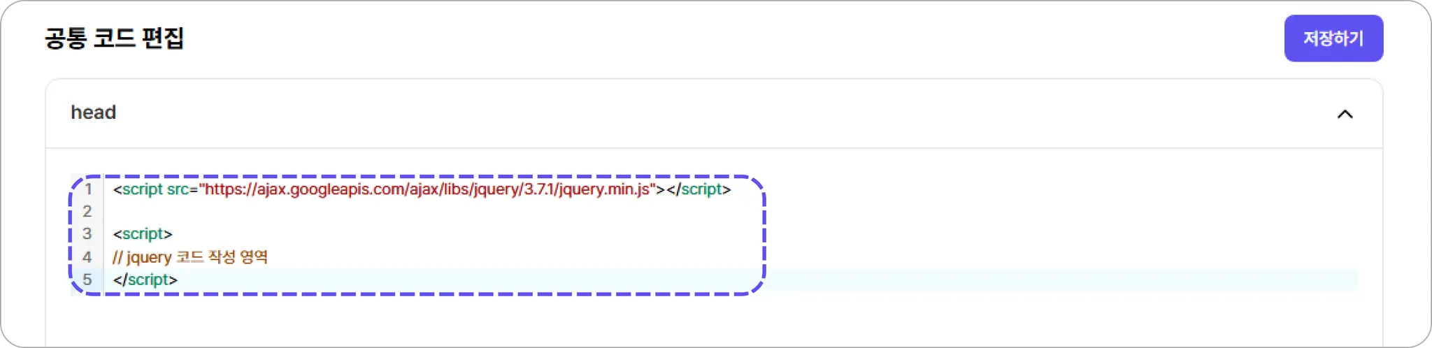 예를 들어, jQuery 라이브러리를 사용하고자 할 때에는 [웹사이트 > 공통 코드 편집]에서 아래와 같이 입력해 주세요.