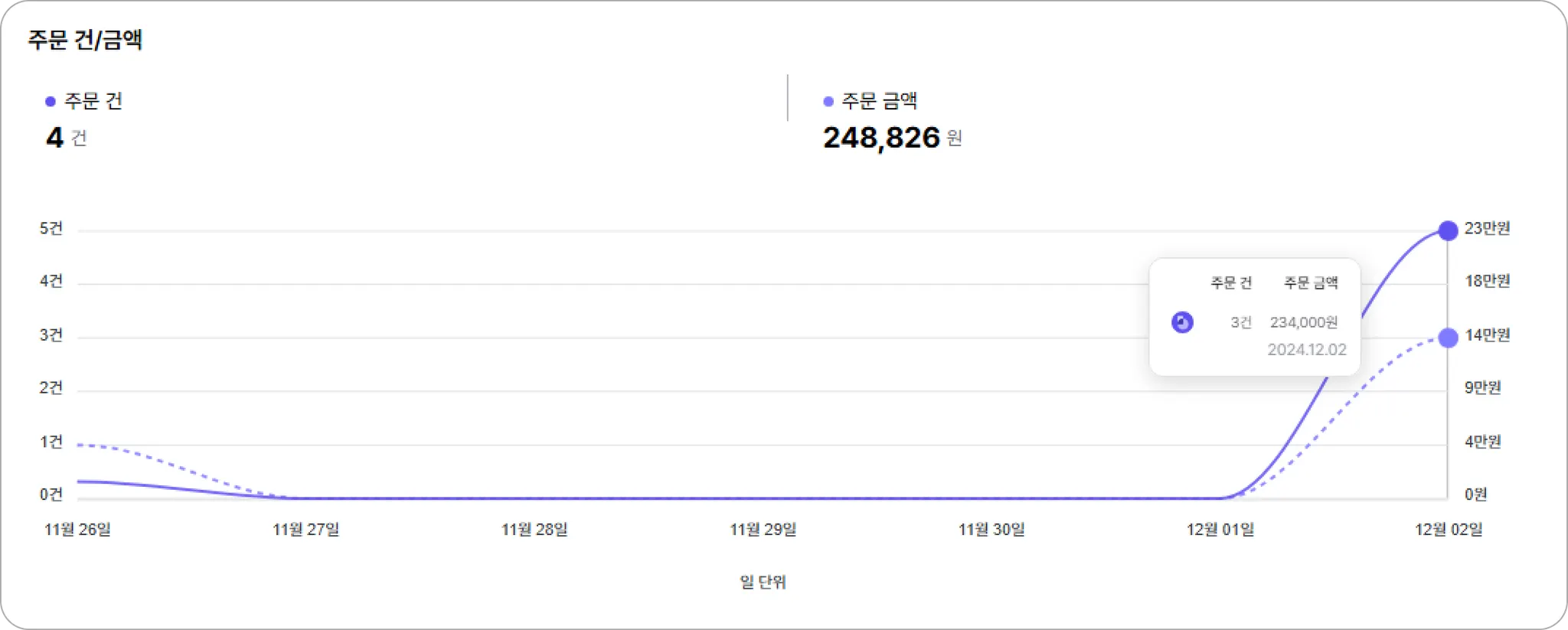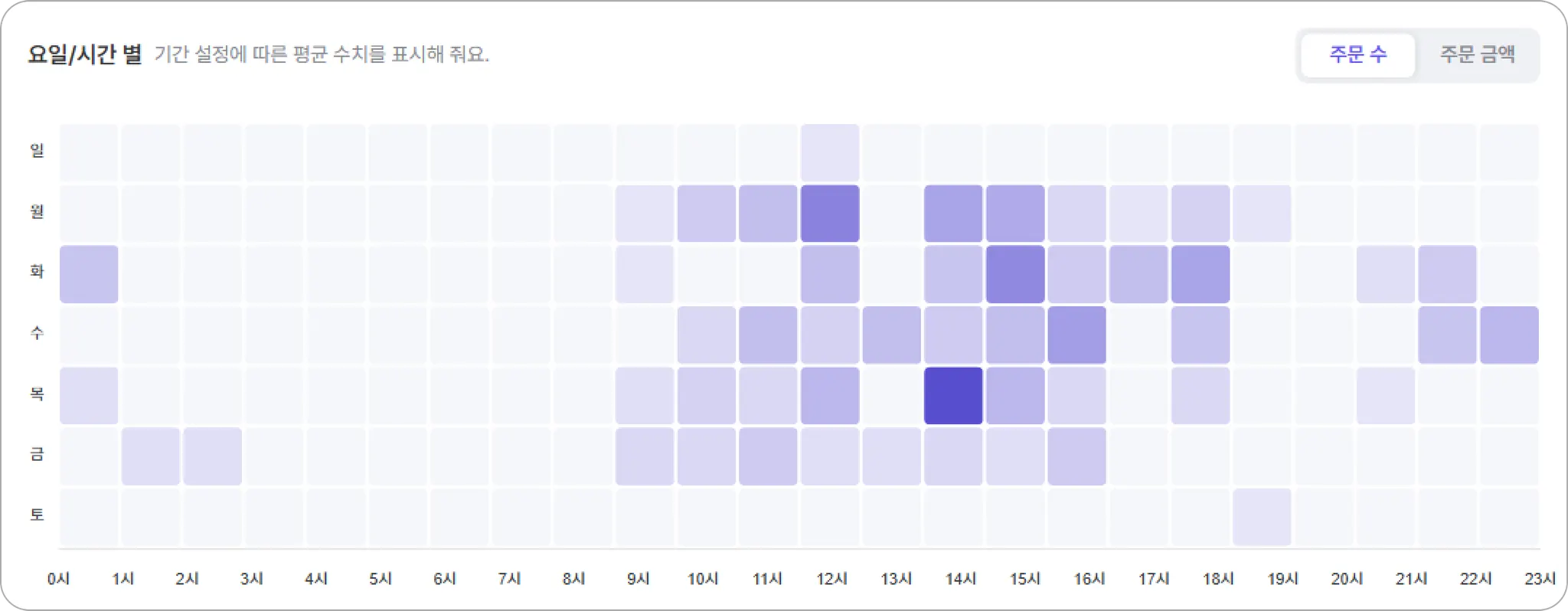 주문이 집중되는 요일이나 시간을 시각적으로 확인할 수 있는 그래프입니다. 이벤트나 프로모션을 기획할 때, 어떤 시점이 가장 유리한지 결정하는 데 도움이 됩니다.