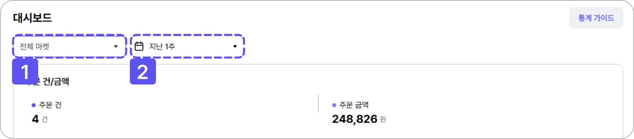 통계는 마켓별로 수집되며, 동일 마켓을 여러 개 연동한 경우 데이터를 합산하여 조회합니다.