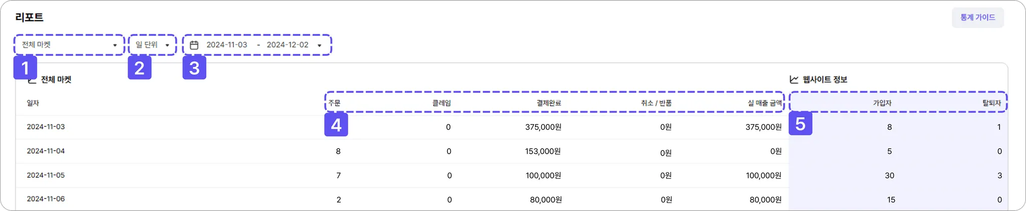 통계는 마켓별로 수집되며, 동일 마켓을 여러 개 연동한 경우 데이터를 합산하여 조회합니다.