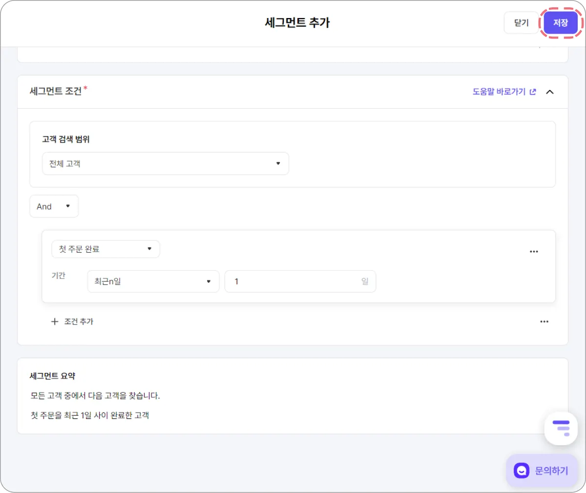 Step 3. 찾고자 하는 고객들의 검색 범위와 조건을 설정 후 오른쪽 상단 저장을 클릭합니다.