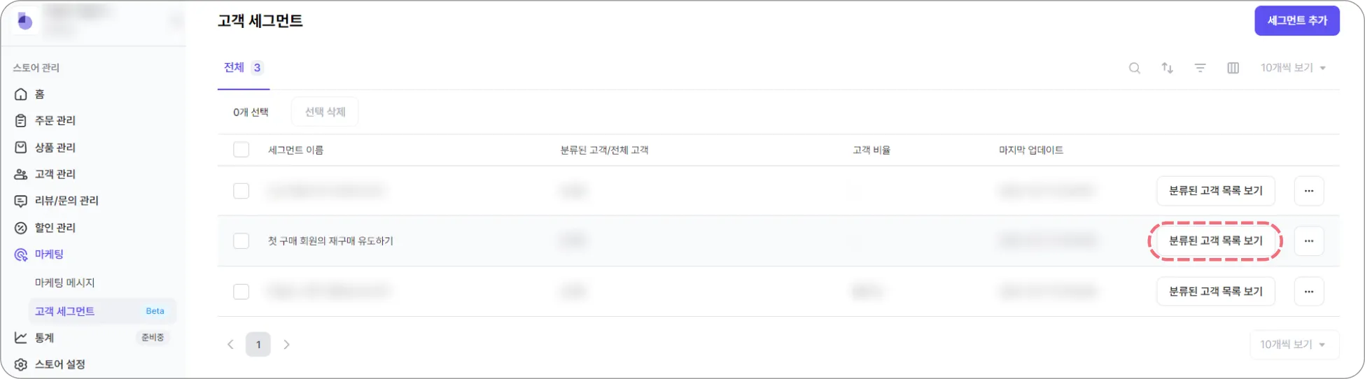 Step 1. [식스샵 프로 > 마케팅 > 고객 세그먼트]에서 세그먼트 추가하기를 클릭합니다.