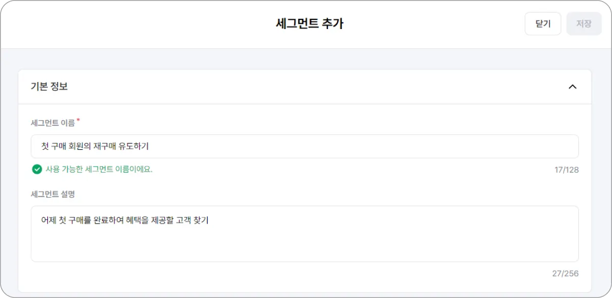 세그먼트 이름과 설명은 외부 노출되지 않아요. 운영자님이 알아보기 편한 내용으로 입력해 주세요.