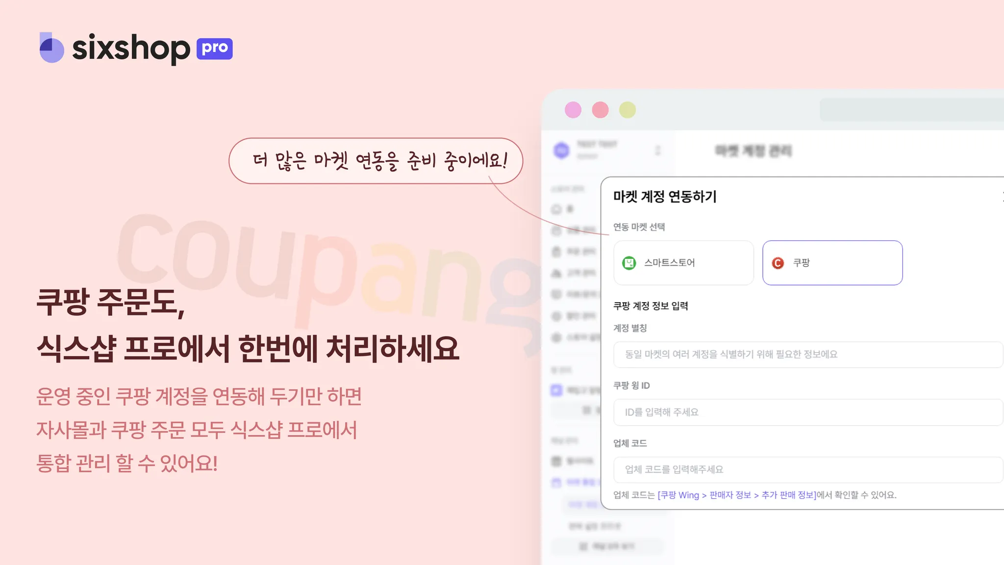 쿠팡 계정 정보만 간단하게 연동해 두면, 쿠팡 주문이 식스샵 프로에 연동되어 자사몰 주문과 통합 관리 할 수 있답니다.