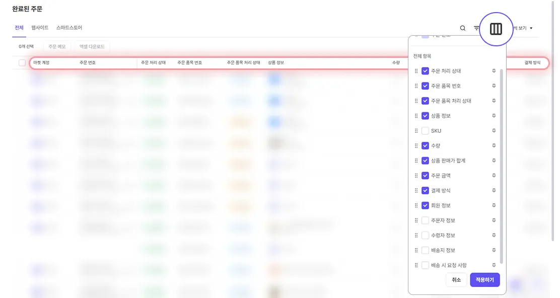 식스샵 프로에서는 식스샵보다 더 많은 항목의 주문 데이터를 한 눈에 확인하고, 주문 목록 테이블에서 볼 수 있는 항목을 자유롭게 편집할 수 있어요.