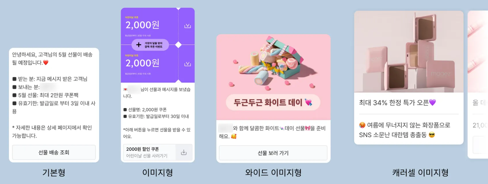 위 이미지처럼 다양한 유형의 친구톡을 지원합니다. 준비 중인 이벤트/프로모션과 어울리는 유형을 선택하여 마케팅 효과를 극대화할 수 있어요.