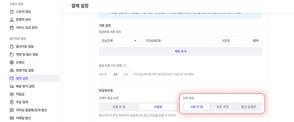 식스샵 프로는 주문 상태에 따라 자동으로 현금 영수증을 발급하거나, 취소하는 설정이 지원되어요. 무통장 입금이 많은 비중을 차지하는 상점이라면, 작업 편의가 크게 개선되었어요.