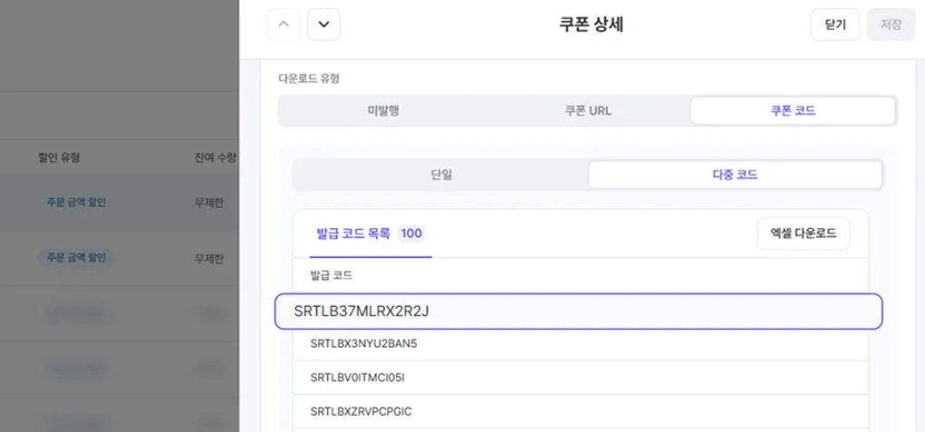 발급된 코드 목록은 엑셀 파일로 다운로드할 수 있어요.