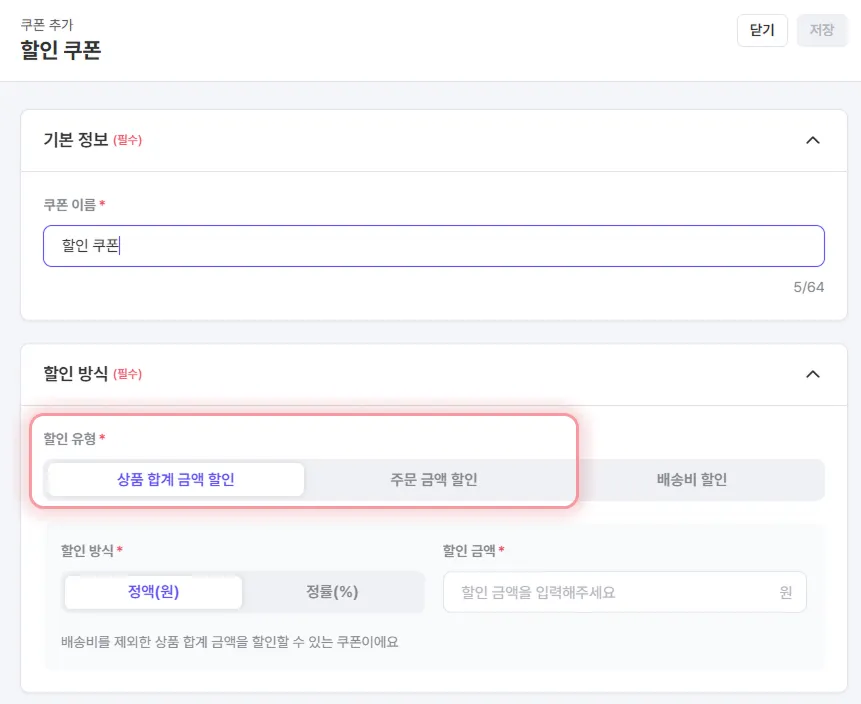 할인 유형(상품 합계 금액/주문 금액) 선택 가능
