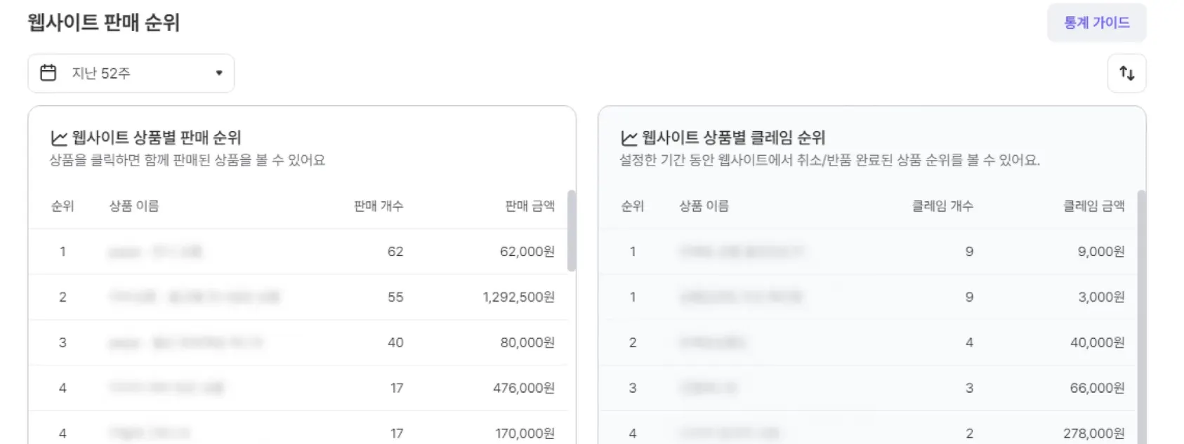 기존 식스샵 통계에서는 상품 판매 순위를 최대 10개까지 확인할 수 있었는데요, 아래와 같이 개선되었어요.