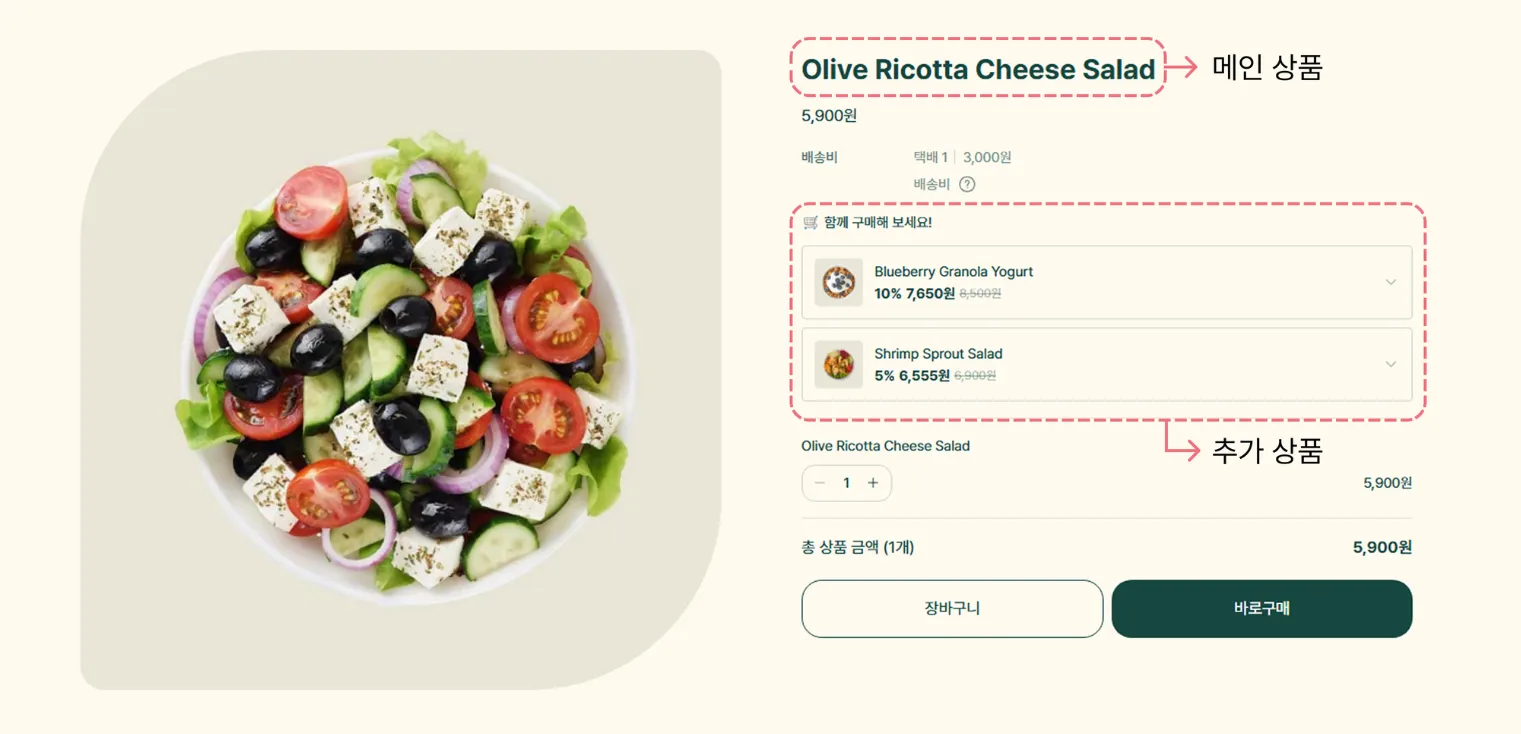 추가 상품은 특정 상품의 상세 페이지에서, 함께 구매하면 좋은 다른 상품을 한 번에 선택할 수 있도록 도와주는 기능으로, 식스샵의 ‘함께 사면 좋은 상품’과 매칭되는 기능이에요.