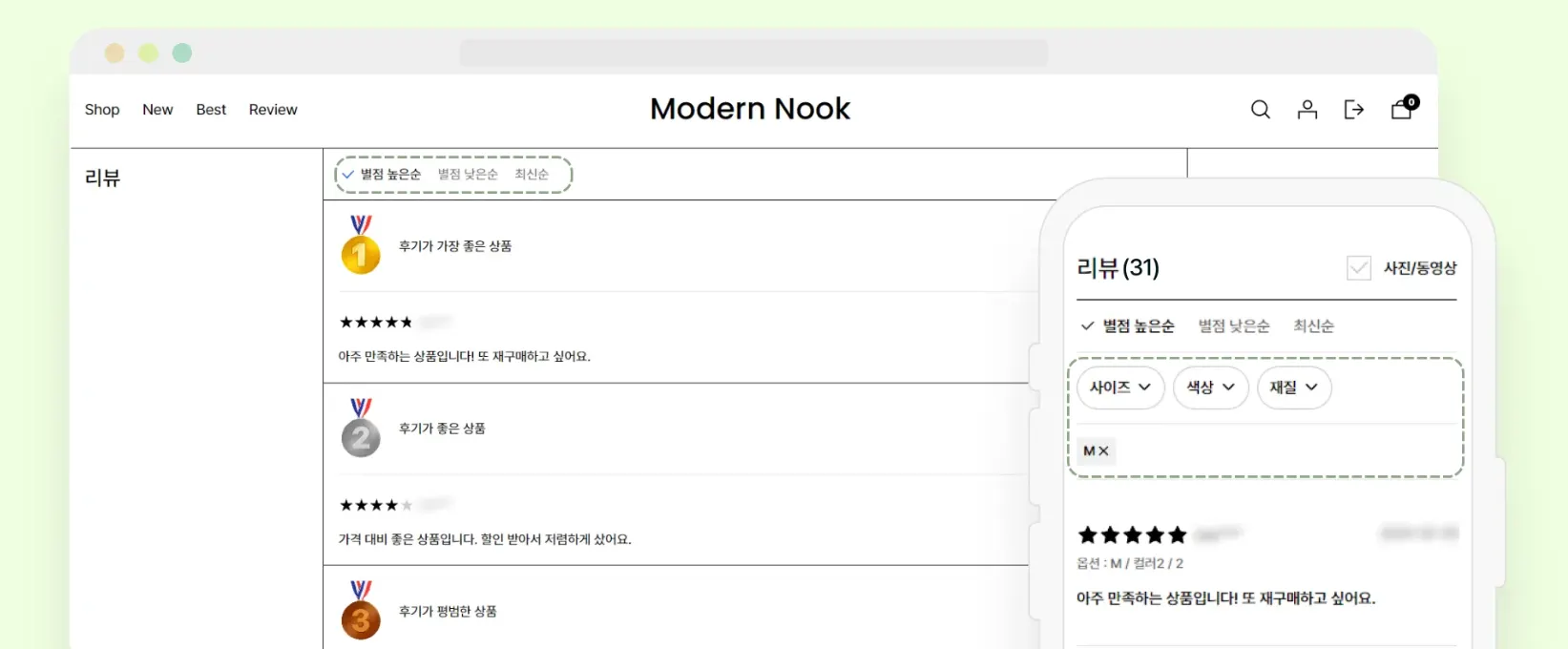 방문자가 원하는 기준으로 리뷰를 조회할 수 있도록 리뷰 정렬&필터를 제공합니다. 수많은 리뷰 중 구매하는 데 필요한 정보를 쉽게 얻을 수 있어요.