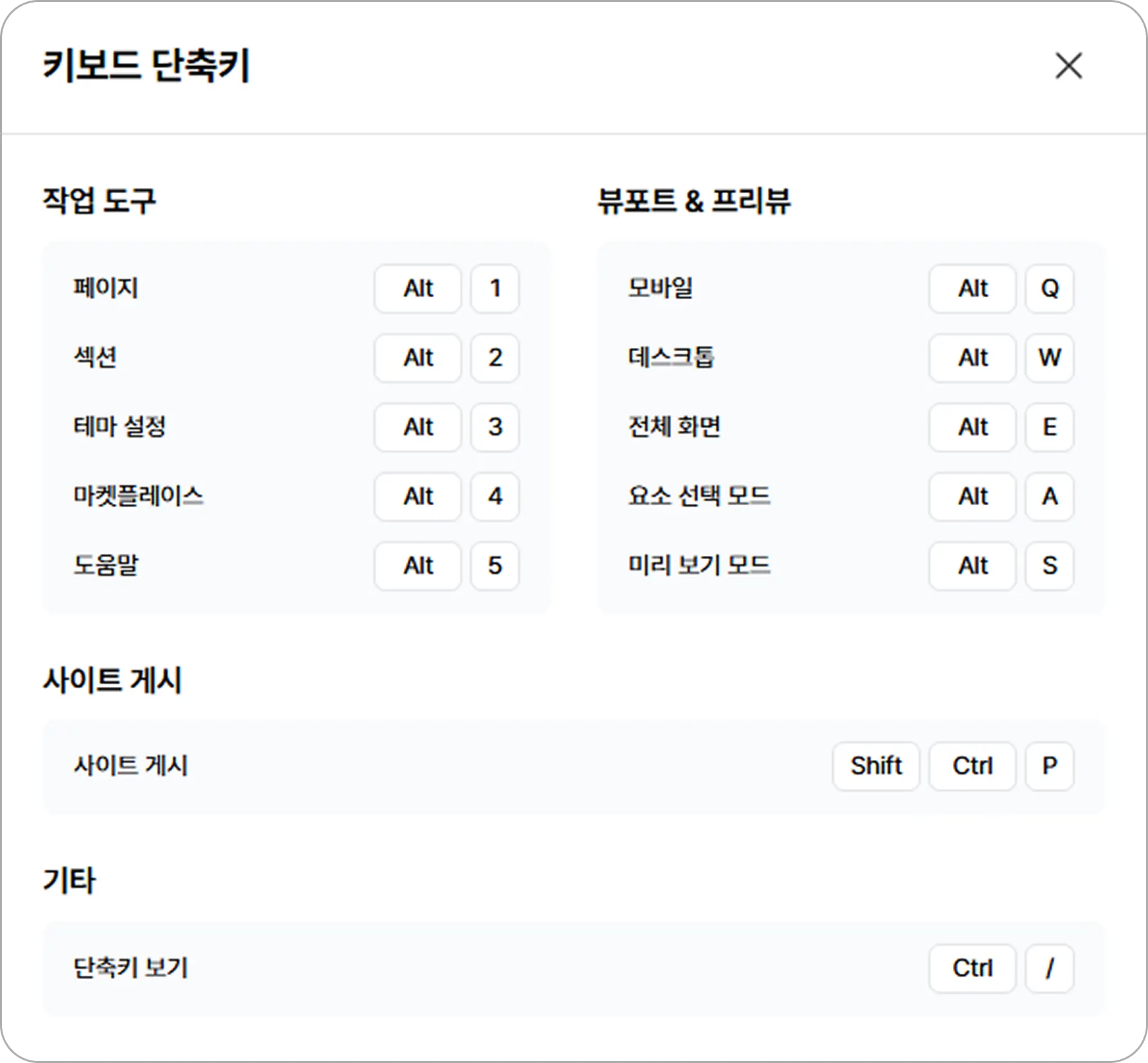 디자인 에디터 상단의 도움말을 누르면 단축키를 확인할 수 있어요.