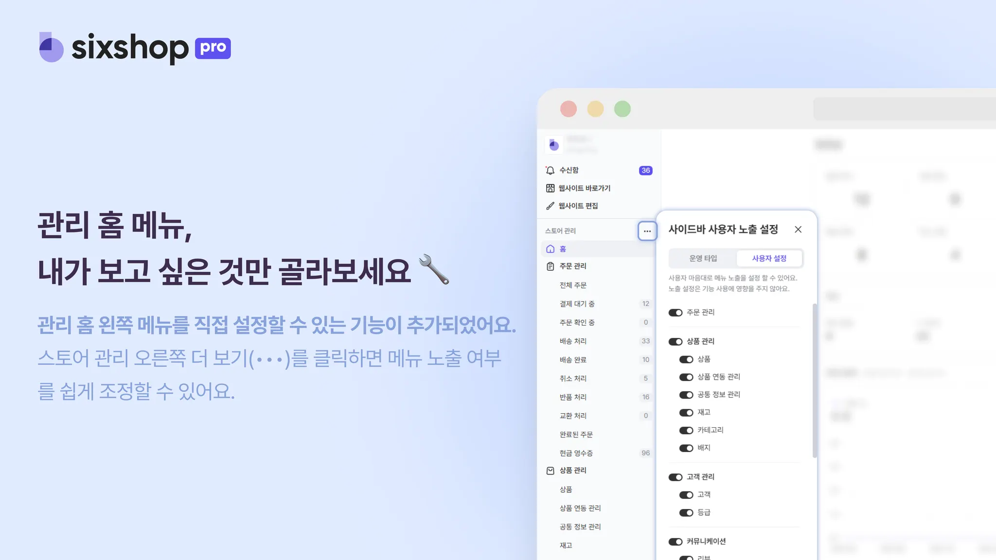 이제 필요한 메뉴만 노출해 관리 홈의 내비게이션도 맞춤형으로 설정하세요