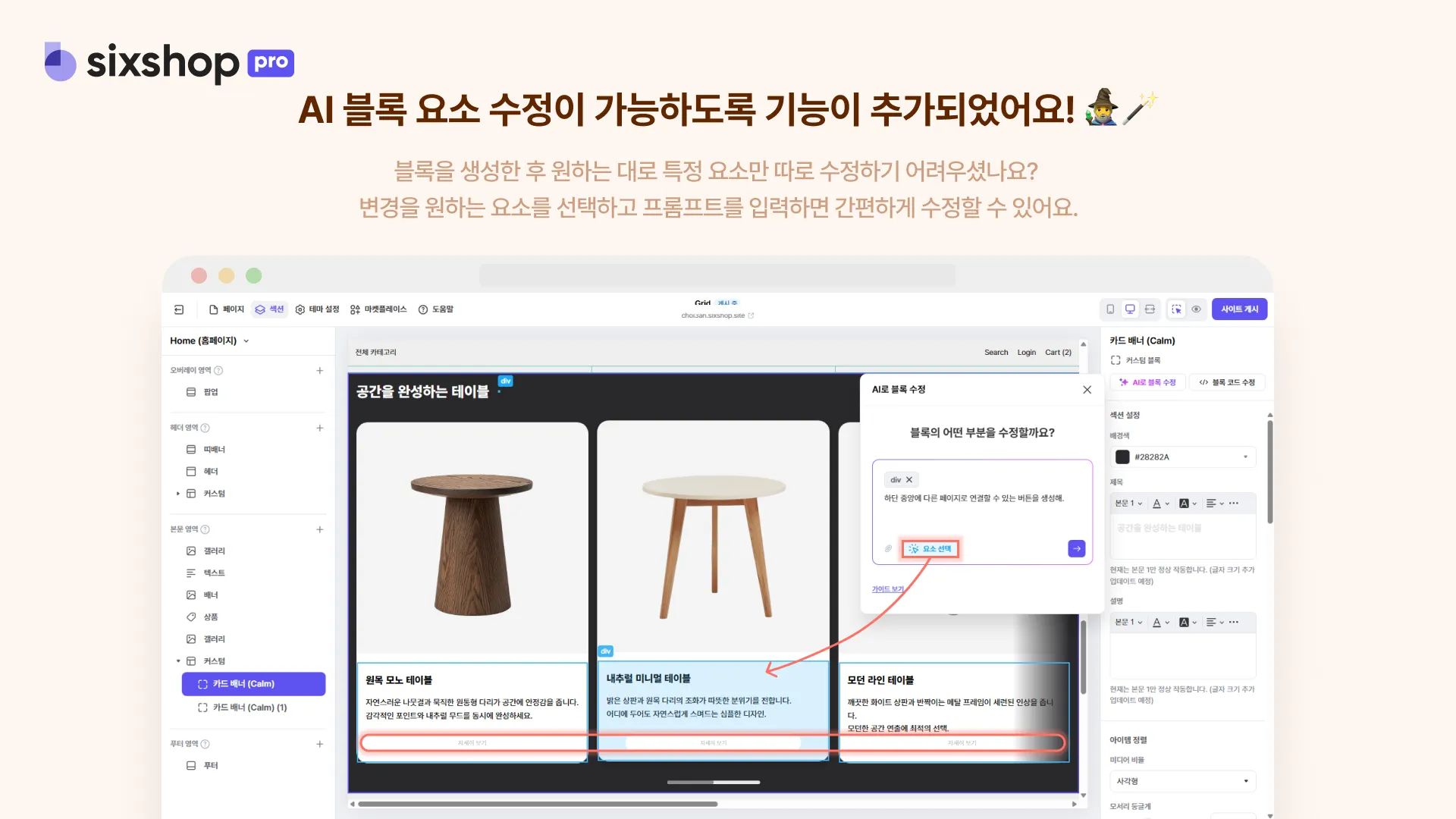이제는 AI 블록 수정 시 [요소 선택] 버튼으로 원하는 요소를 직접 선택하고, 수정 사항만 입력하면 된답니다!