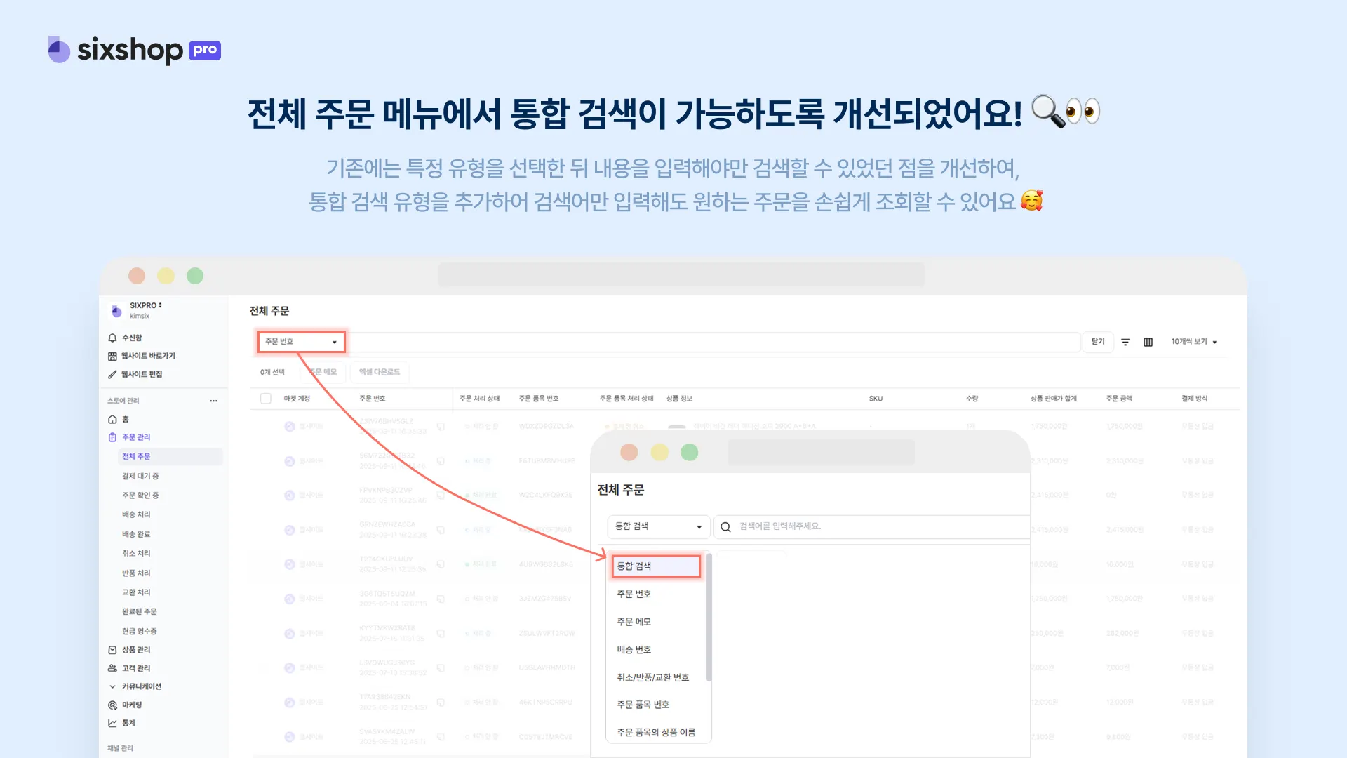 기존에는 주문을 조회할 때 특정 항목(예: 주문번호, 주문자명 등)을 먼저 선택한 뒤 검색어를 입력해야