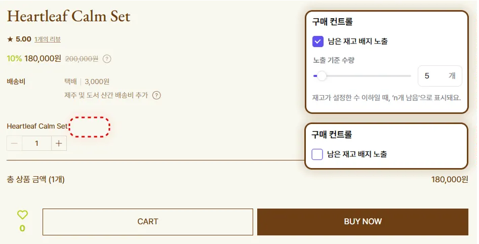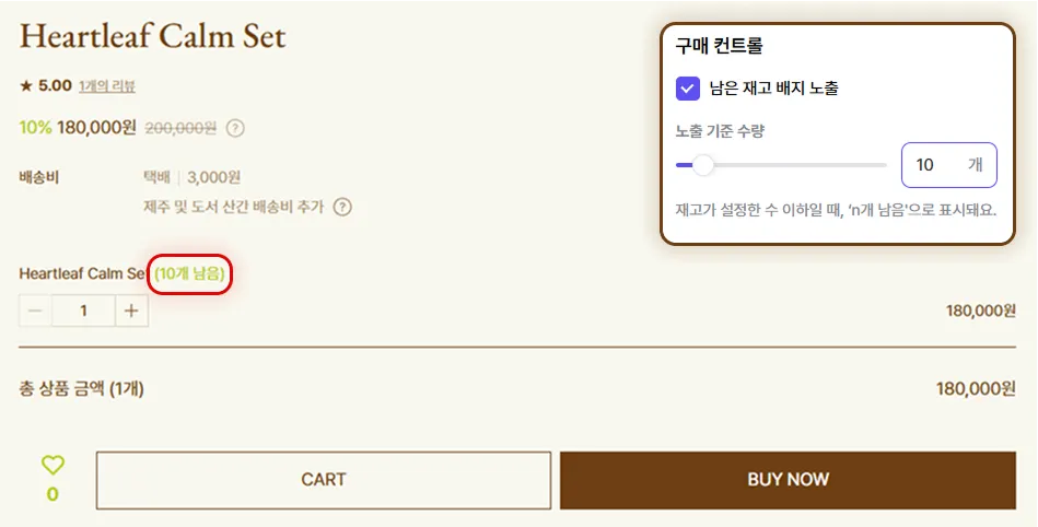 재고 배지 노출 기능을 사용하지 않거나, 기준 수량을 10개보다 적게 운영하면, 재고가 10개 남은 시점에 수량이 노출되지 않아요.