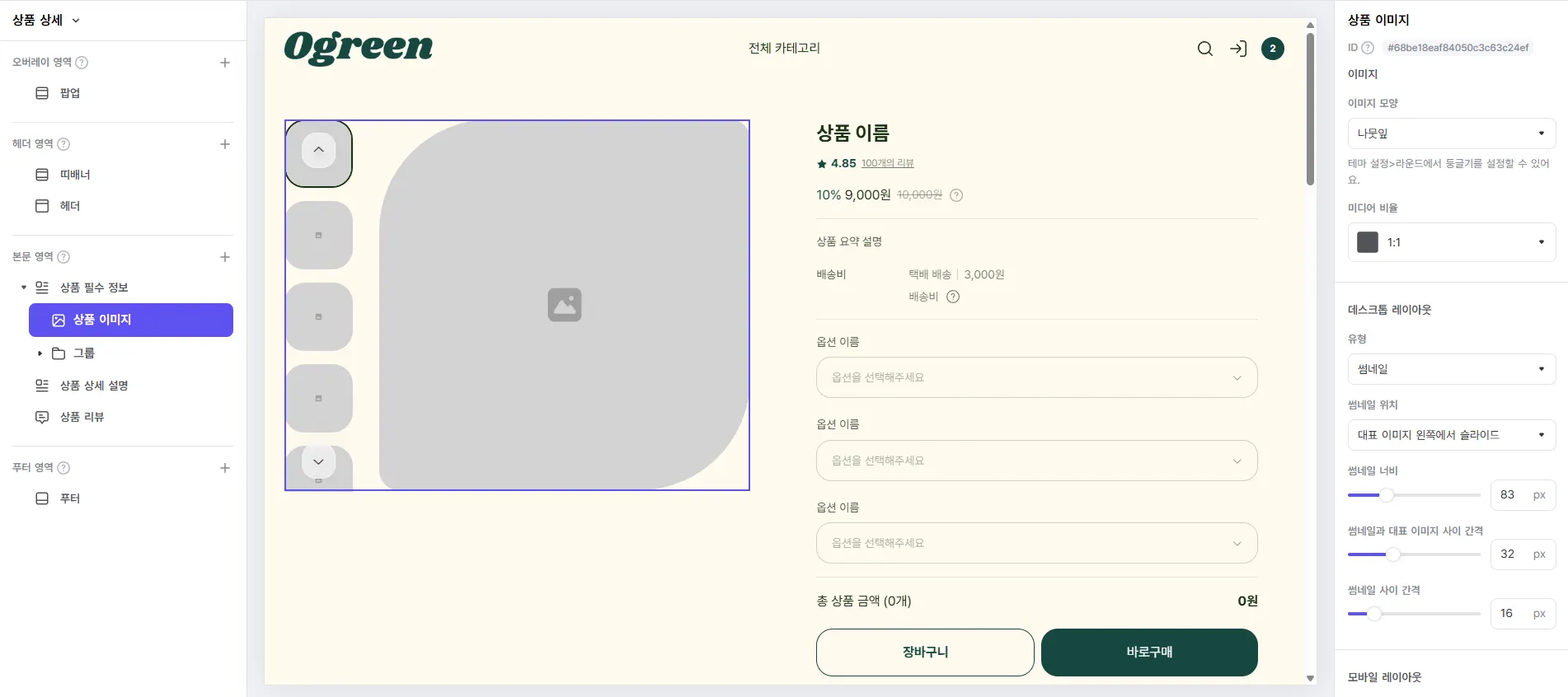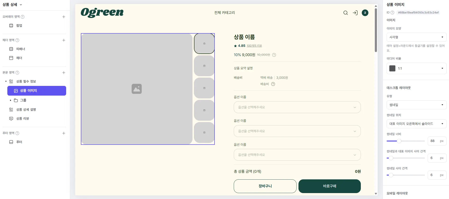이미지 모양을 ‘사각형’, 썸네일 위치를 ‘대표 이미지 오른쪽에서 슬라이드’로 설정하고 썸네일 간격을 6px로 좁힌 예시