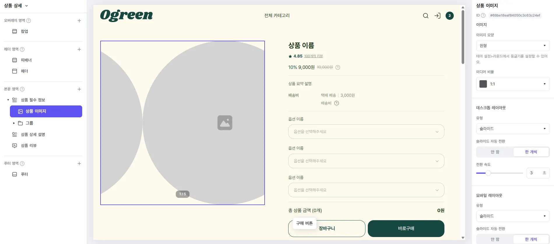 이미지 모양을 ‘나뭇잎’, 썸네일 위치를 ‘대표 이미지 왼쪽에서 슬라이드’로 설정한 예시