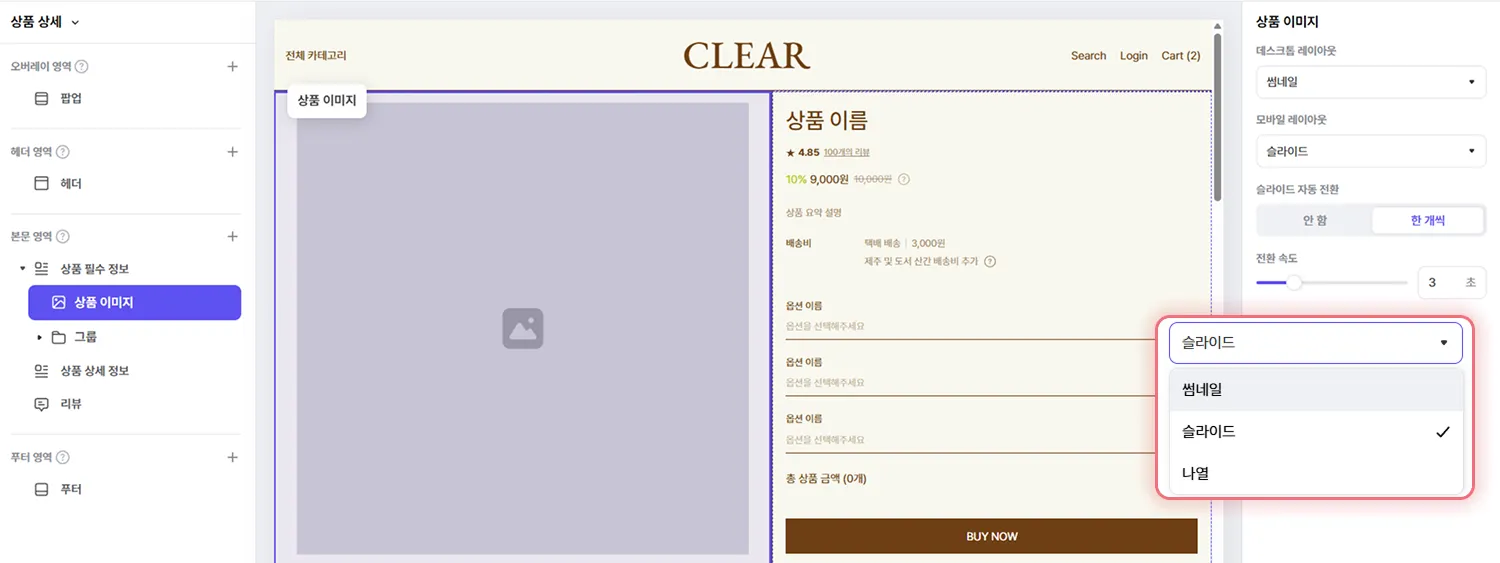 기존 식스샵도 상품 이미지 레이아웃을 썸네일, 슬라이드, 나열 중에 선택할 수 있었지만 이 설정은 데스크탑과 모바일에 공통 적용되었는데요. 식스샵 프로에서는 기기별 레이아웃을 별도 설정할 수 있어요.
