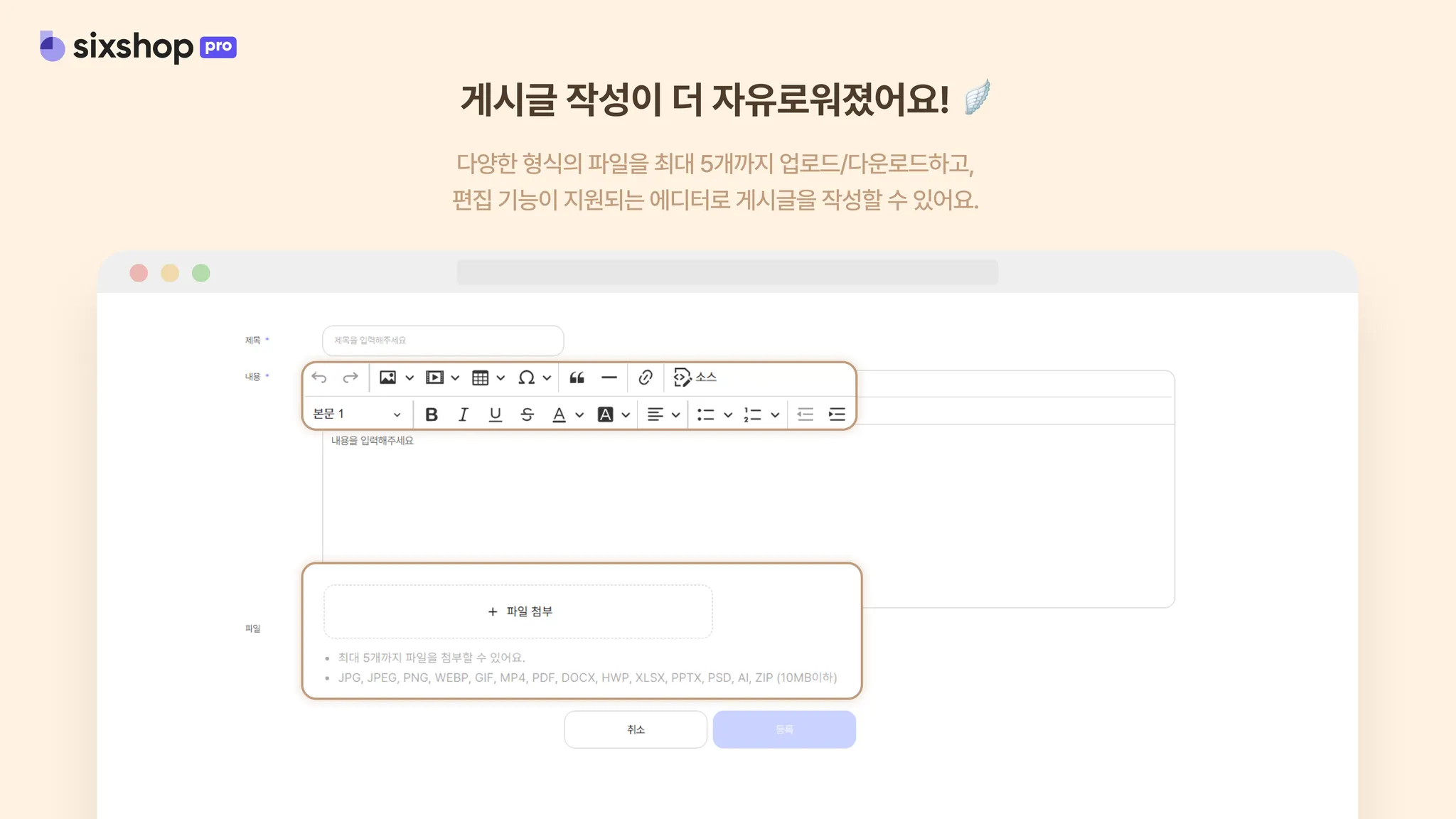 파일 업로드 기능으로 이미지, 문서, 영상 등 다양한 파일을 최대 5개까지 첨부할 수 있어요.