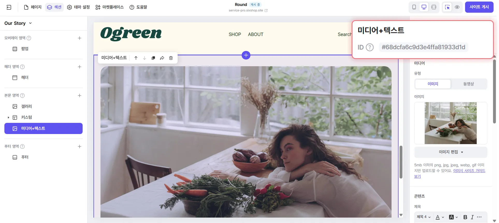 예를 들어, ABOUT 페이지의 미디어+텍스트 섹션의 ID를