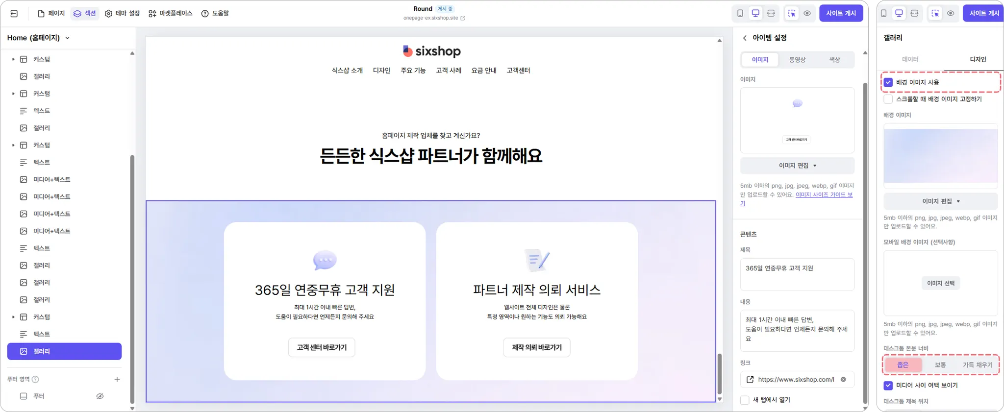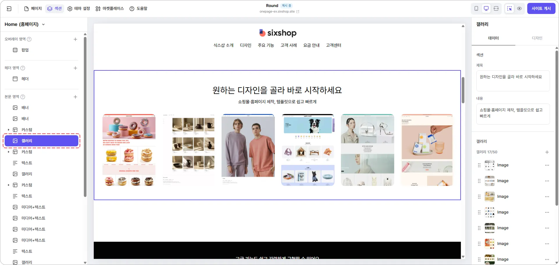 비주얼 중심의 콘텐츠에는 여러 이미지를 보여줄 수 있는 갤러리 섹션이 유용해요.