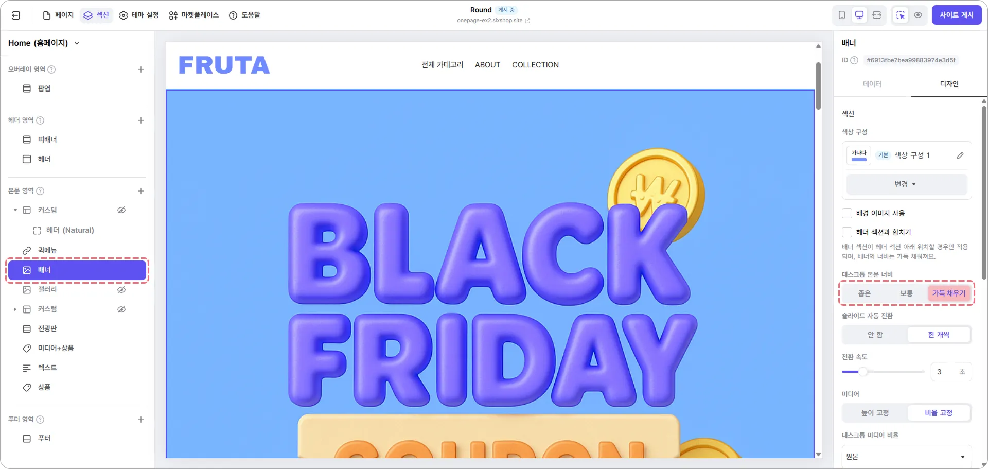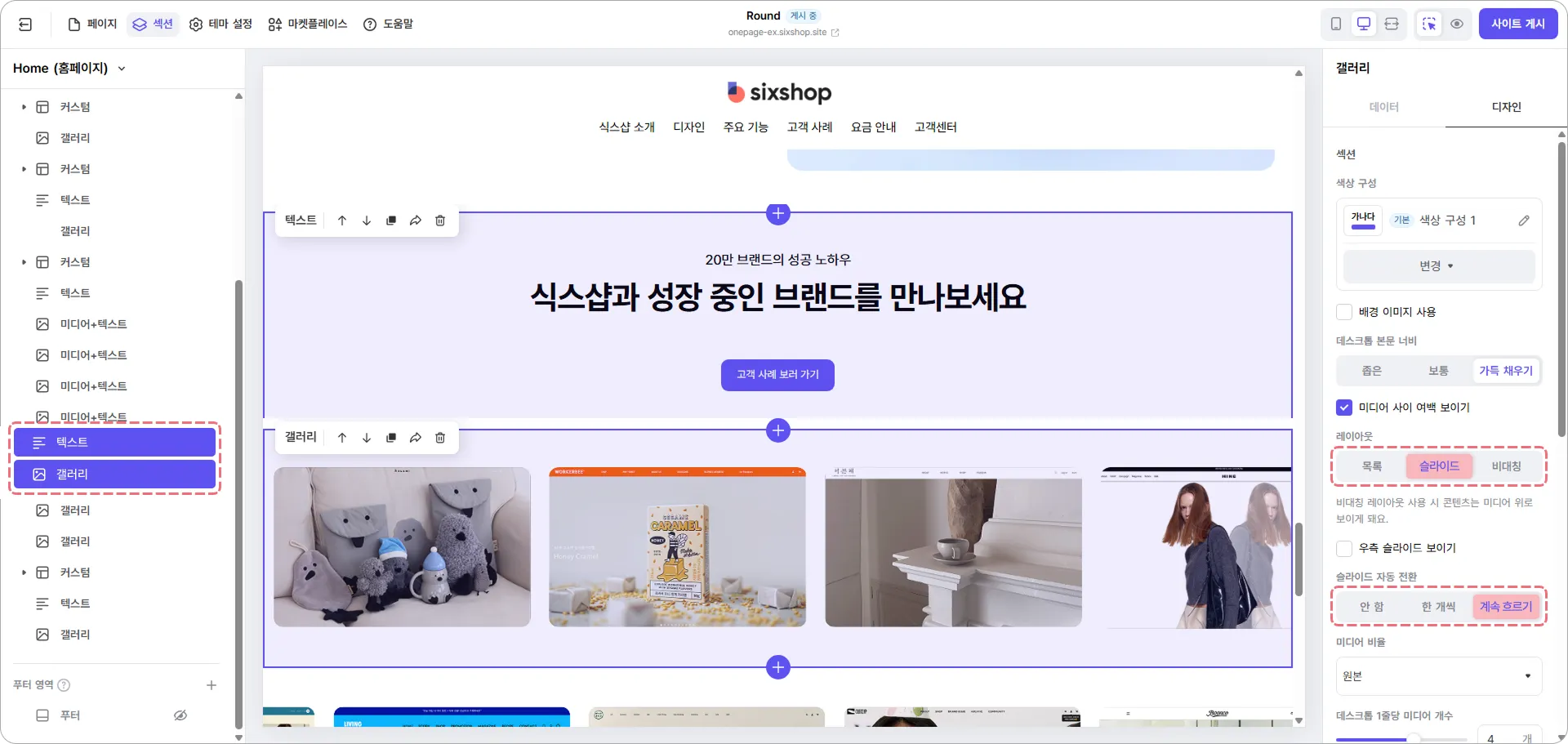 각 섹션은 슬라이드 레이아웃으로 설정하고, 자동으로 계속 흐르도록 전환 효과를 적용했어요.