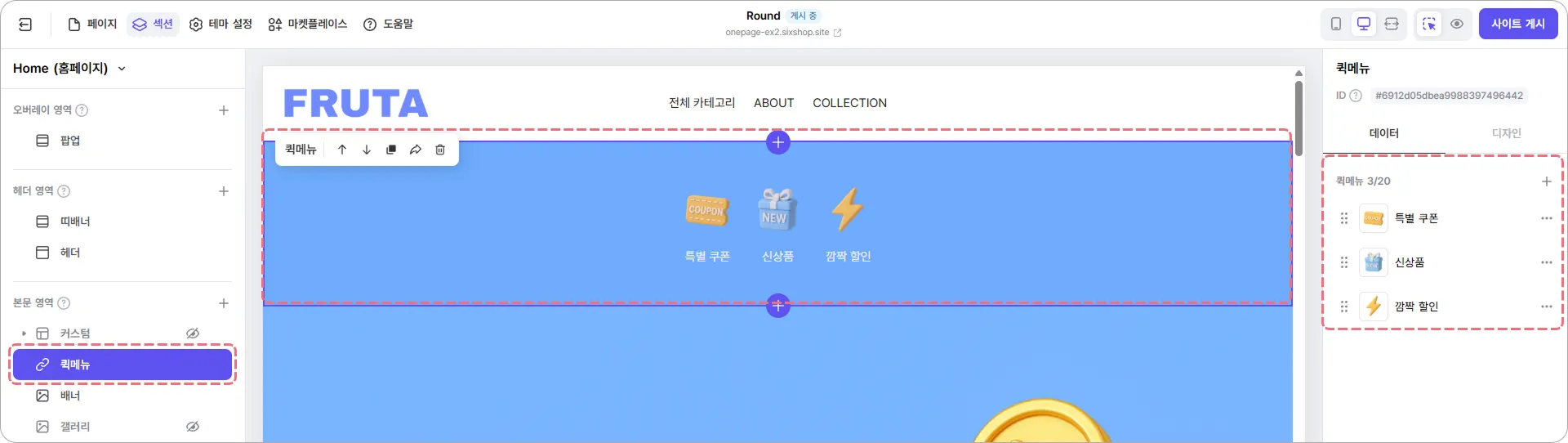 디자인 에디터 오른쪽 상단의 사이트 게시 를 클릭하면, 웹사이트에 수정한 내용이 반영됩니다.