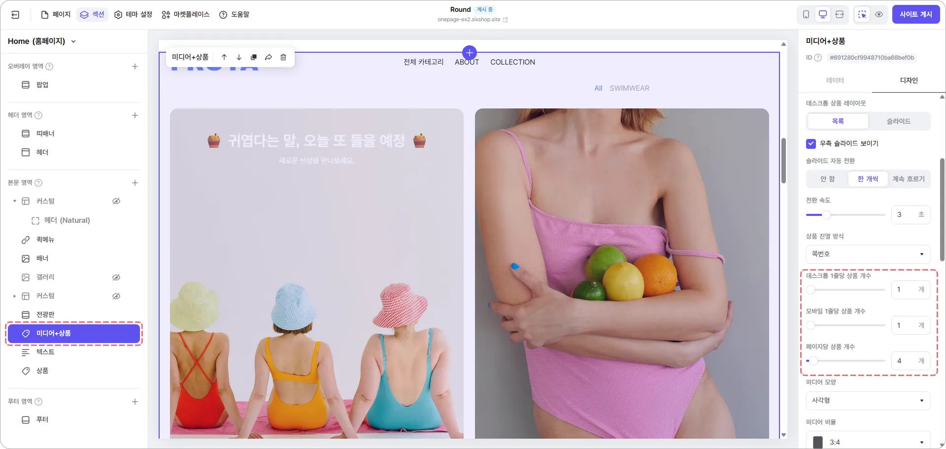 예시 사이트에서는 신상품 영역에 미디어 + 상품 섹션을, 깜짝 할인 영역에는 상품 섹션을 활용했어요.
