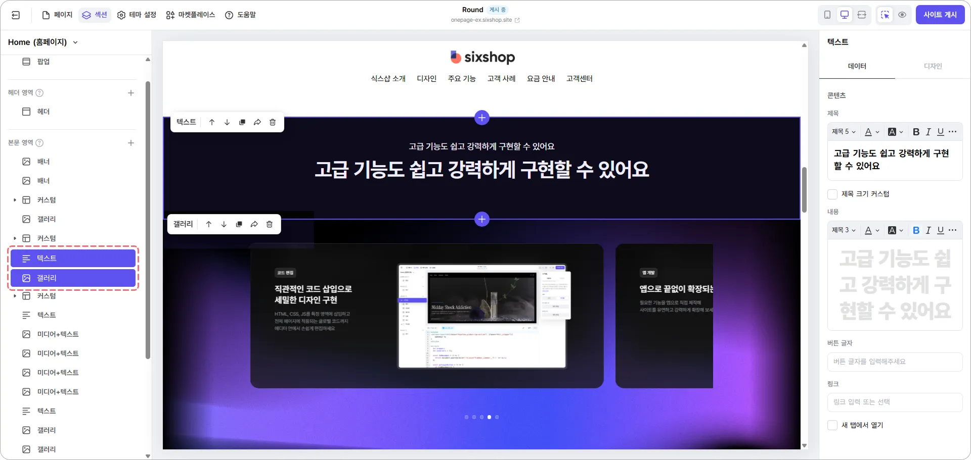 강조 문구는 텍스트 섹션으로 구성하고, 주요 기능은 카드 형태로 제작한 이미지를 갤러리 섹션으로 표현했어요.