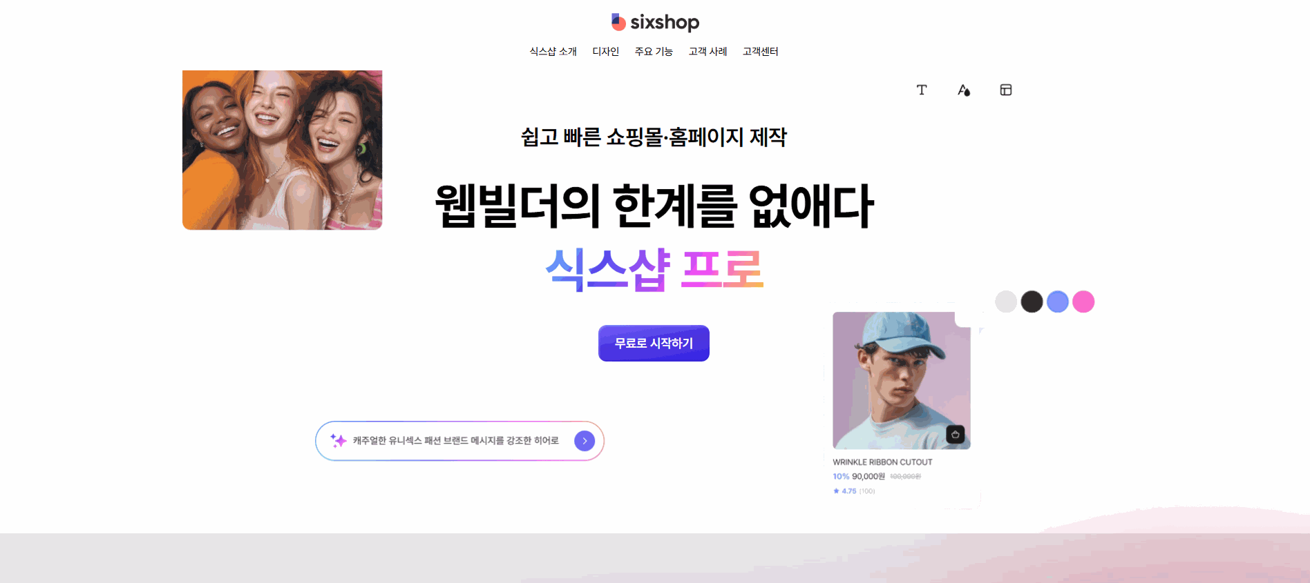 식스샵을 예시로 식스샵 소개, 디자인, 주요 기능, 고객 사례, 고객센터를 한 페이지에 구성해 볼게요.