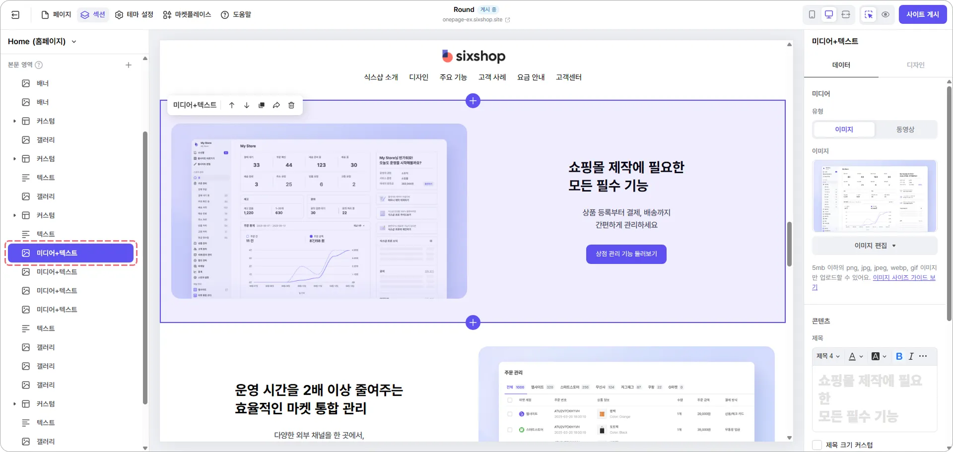 문구를 직접 입력해 이미지와 함께 보여주고 싶다면 미디어 + 텍스트 섹션을 활용해 보세요.
