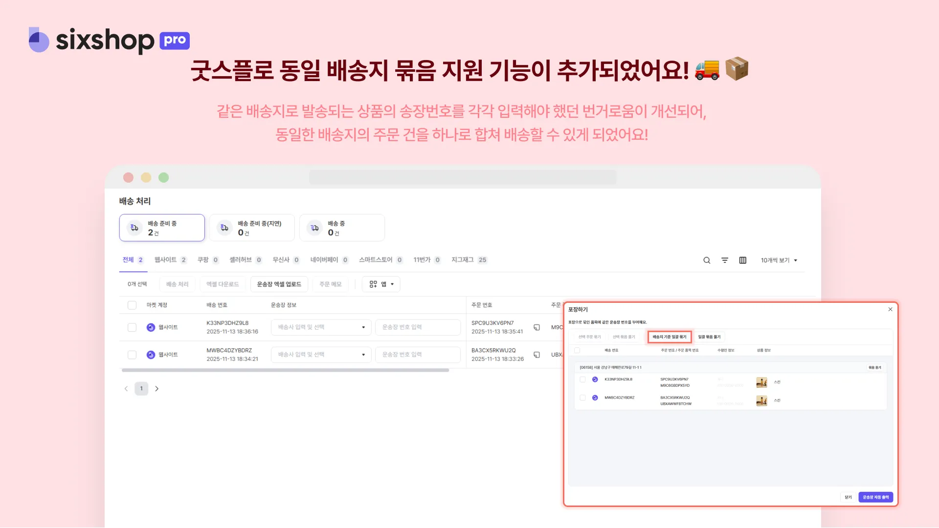 이제는 주소지가 동일한 주문 건을 한 번에 묶어서 발송할 수 있어요.