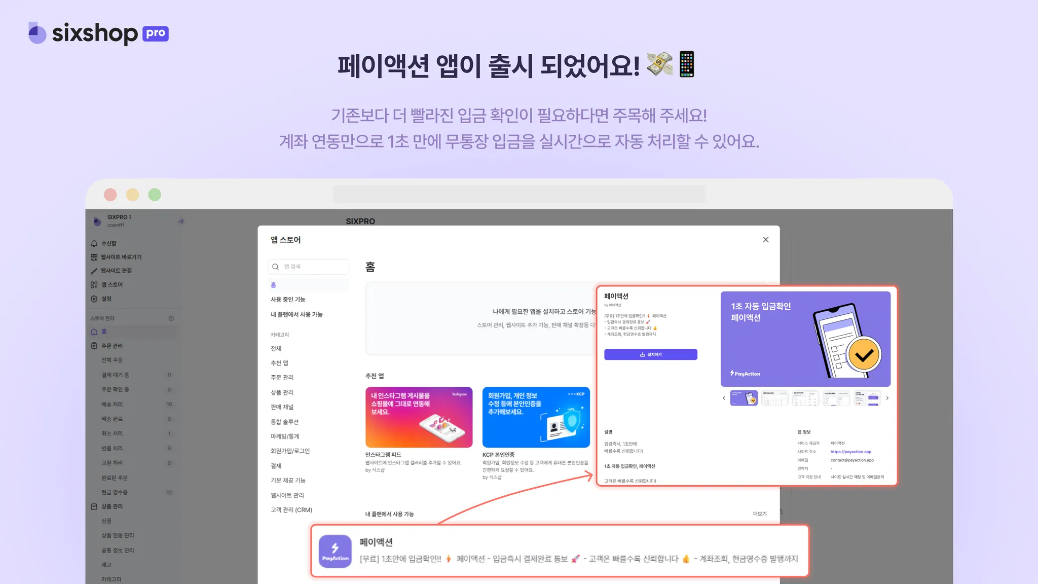 식스샵 프로 관리 홈 왼쪽 네비게이션의 [앱 스토어]를 클릭하면 페이액션 앱을 설치할 수 있어요.