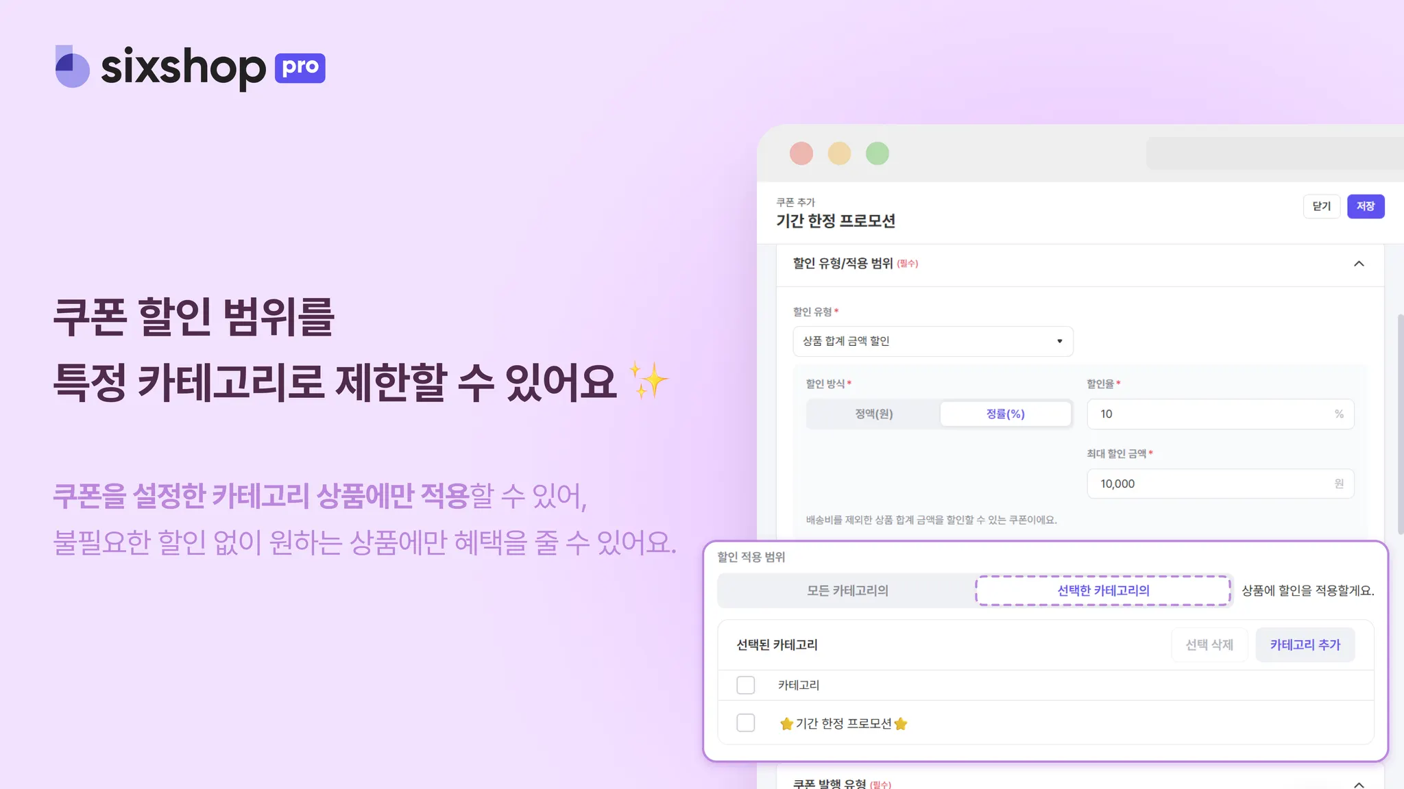 쿠폰을 발행할 때 할인 적용 범위를 카테고리 단위로 설정할 수 있어요