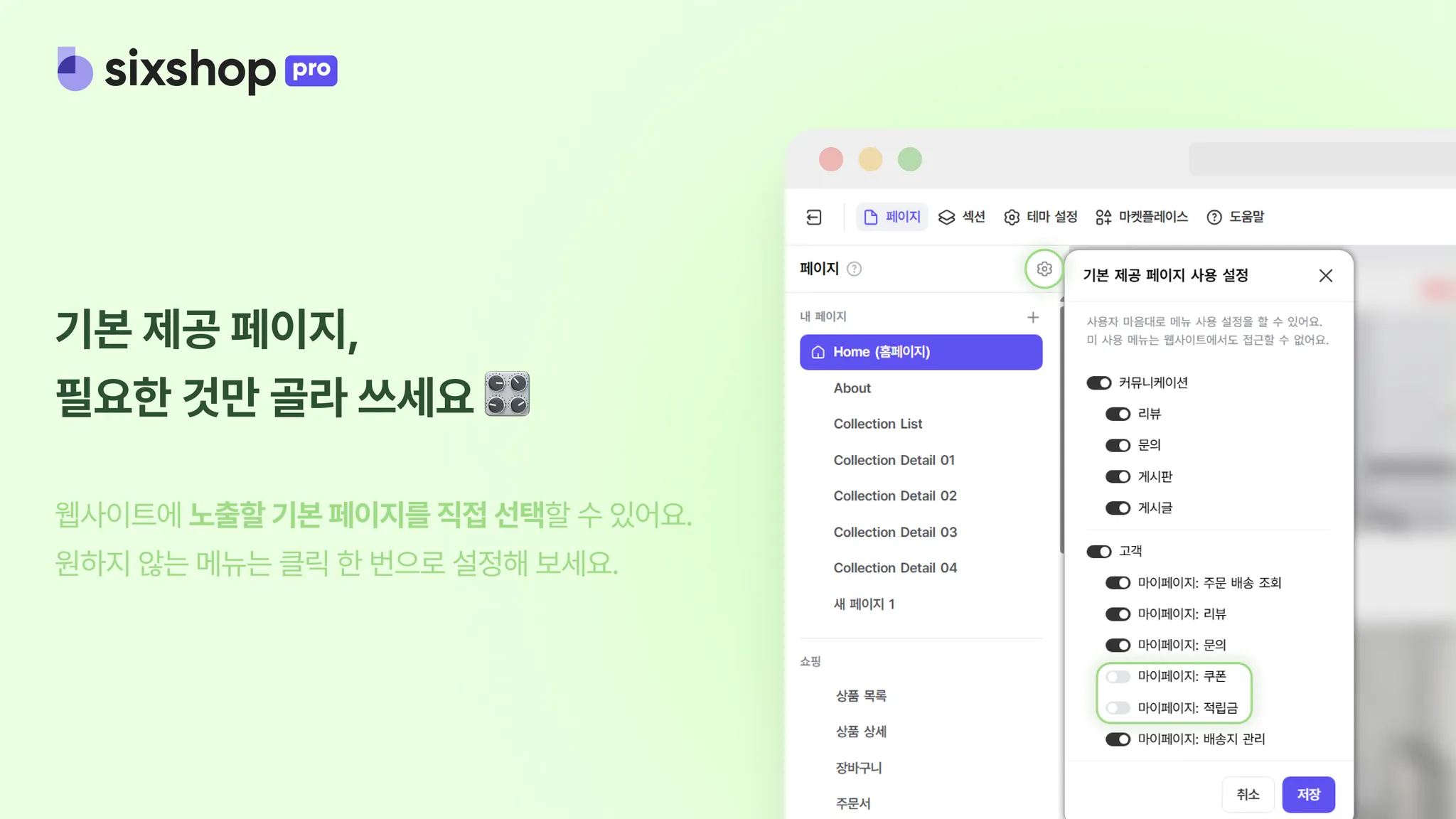 필요에 따라 기본 제공 페이지의 노출 여부를 설정할 수 있게 되었어요.