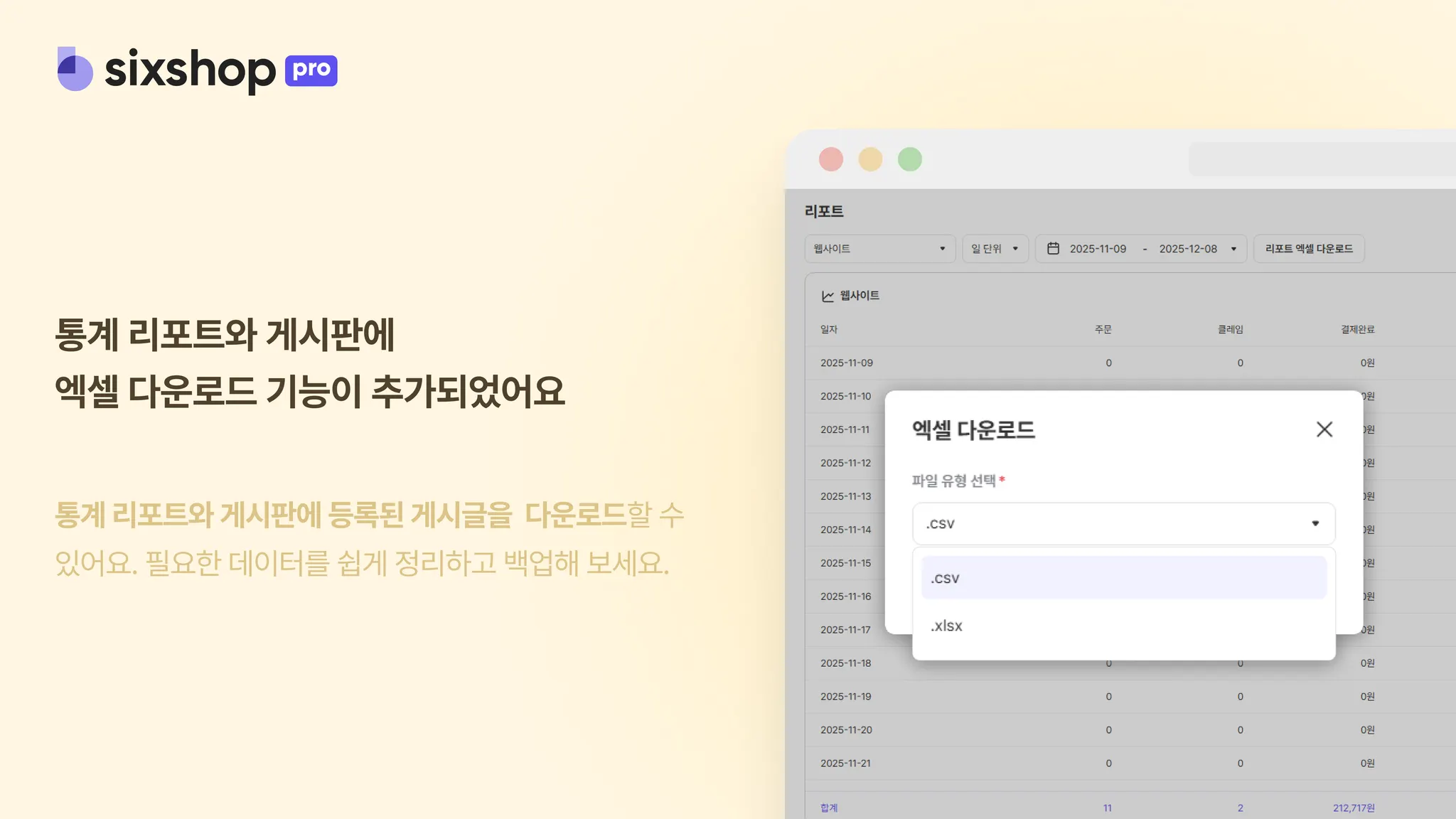 이제 통계의 리포트와 게시판에 등록된 게시글도 엑셀 파일로 다운로드할 수 있어요