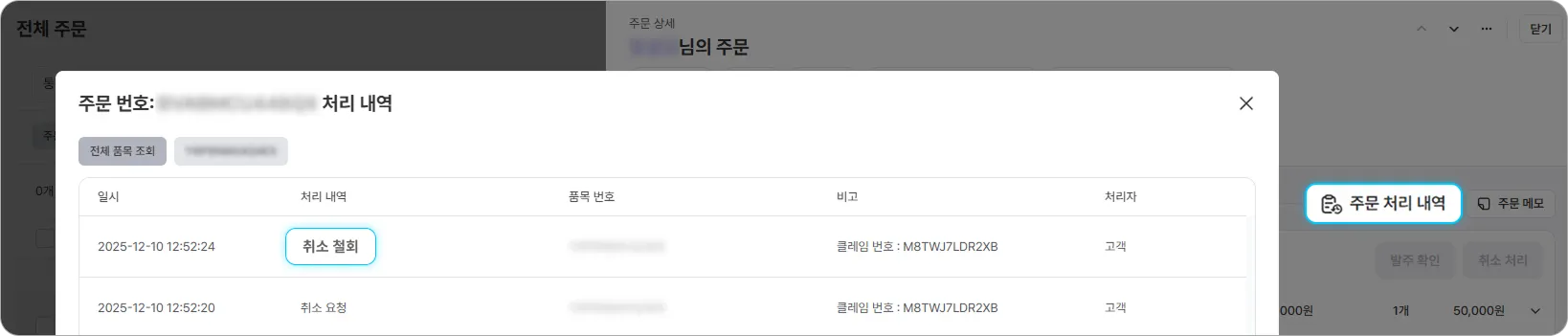 구매자가 취소를 철회한 경우, 주문 상세의 처리 내역 문구가 ‘배송 전 주문 취소’에서 ‘취소 철회’로 변경되었어요.
