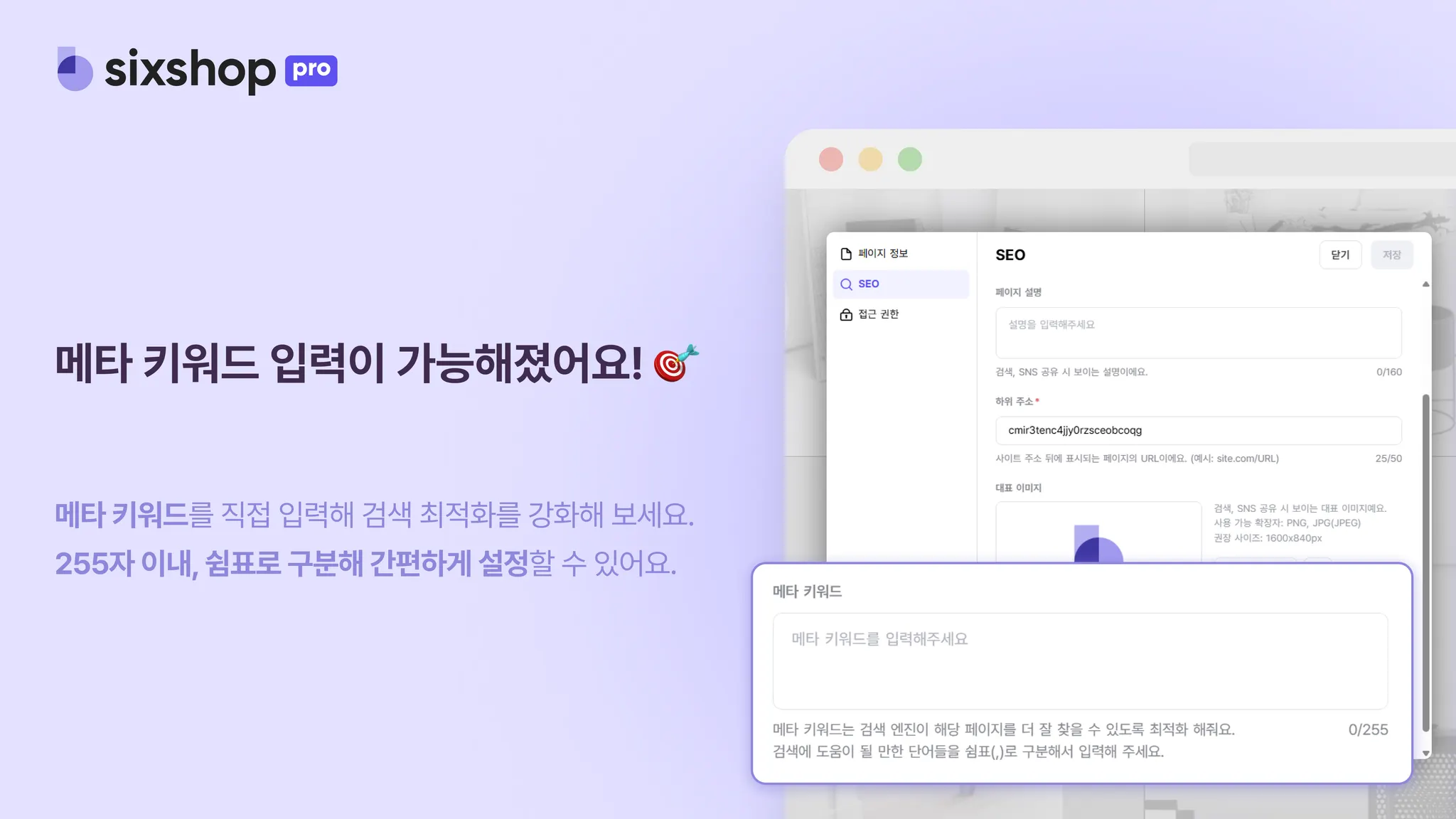 페이지마다 메타 키워드 입력 필드가 새롭게 추가되어,