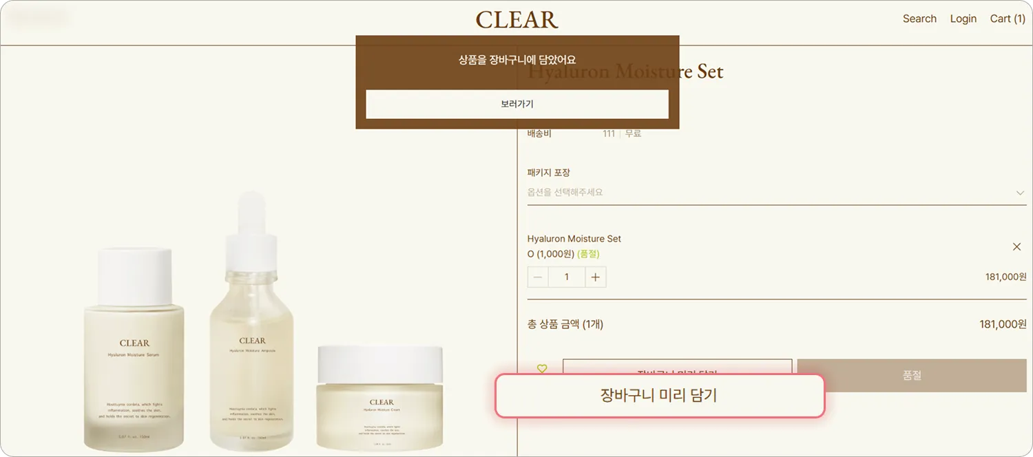 상품을 장바구니에 미리 담아 두고 판매 오픈 시점에 빠르게 구매할 수 있어요. 정기적인 프로모션이나 신상품 판매가 있다면 꼭 활용해 보세요.
