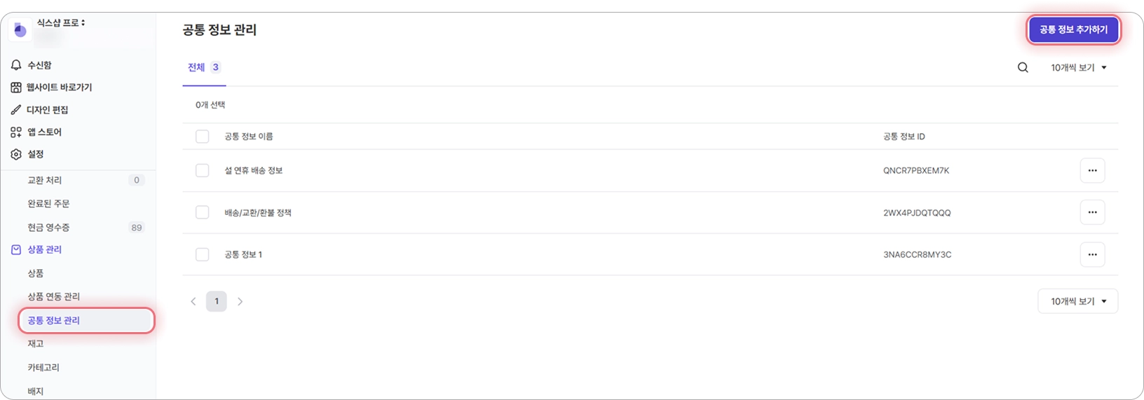 ① [상품 관리 > 공통 정보 관리]에서 공통 정보 추가하기 버튼으로 신규 공통 정보를 생성합니다.