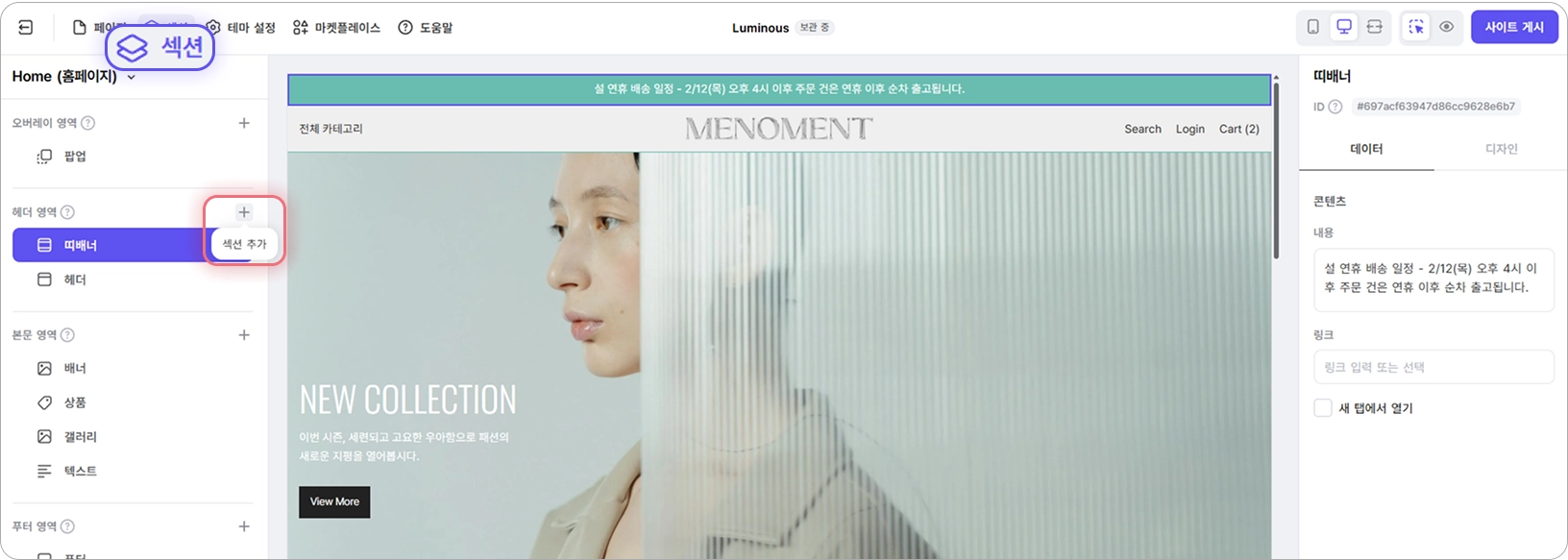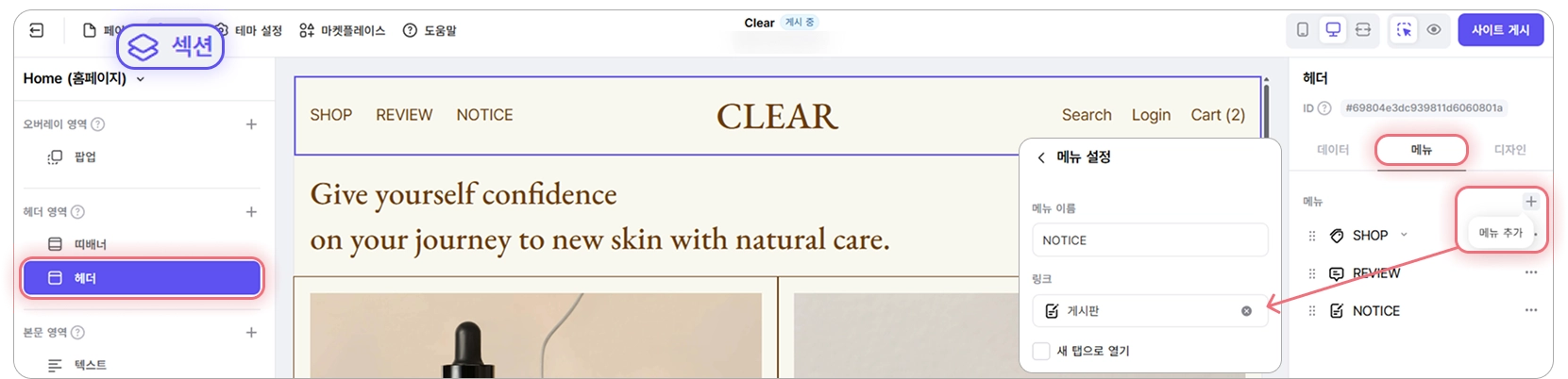 ② 디자인 에디터의 [섹션 > 헤더] 클릭 후 [메뉴] 탭에서 메뉴 추가(+)하여 ‘게시판’과 링크 연결된 메뉴를 생성합니다.