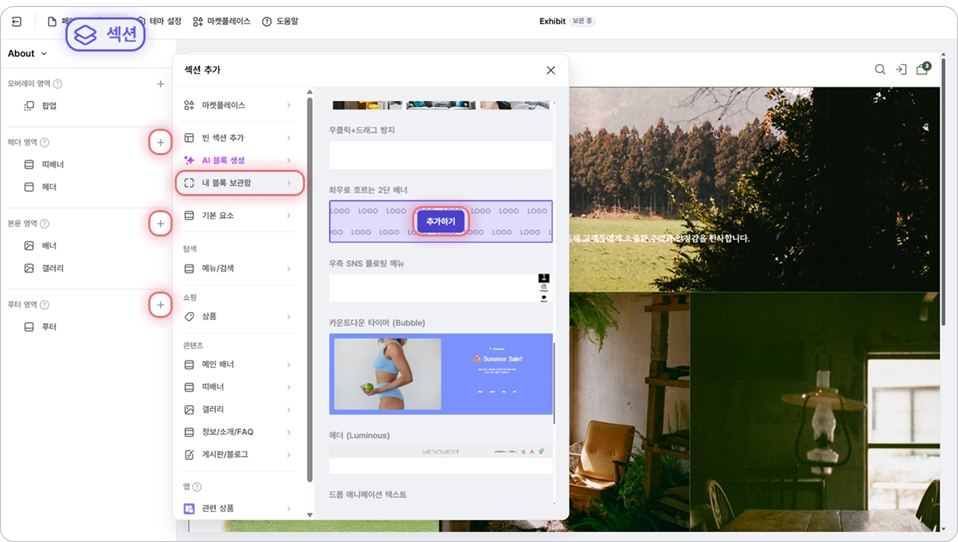 ② 디자인 에디터의 [섹션]에서 원하는 영역의 섹션 추가(+)를 클릭하고, 조금 전 설치한 블록을 [내 블록 보관함]에서 추가합니다.