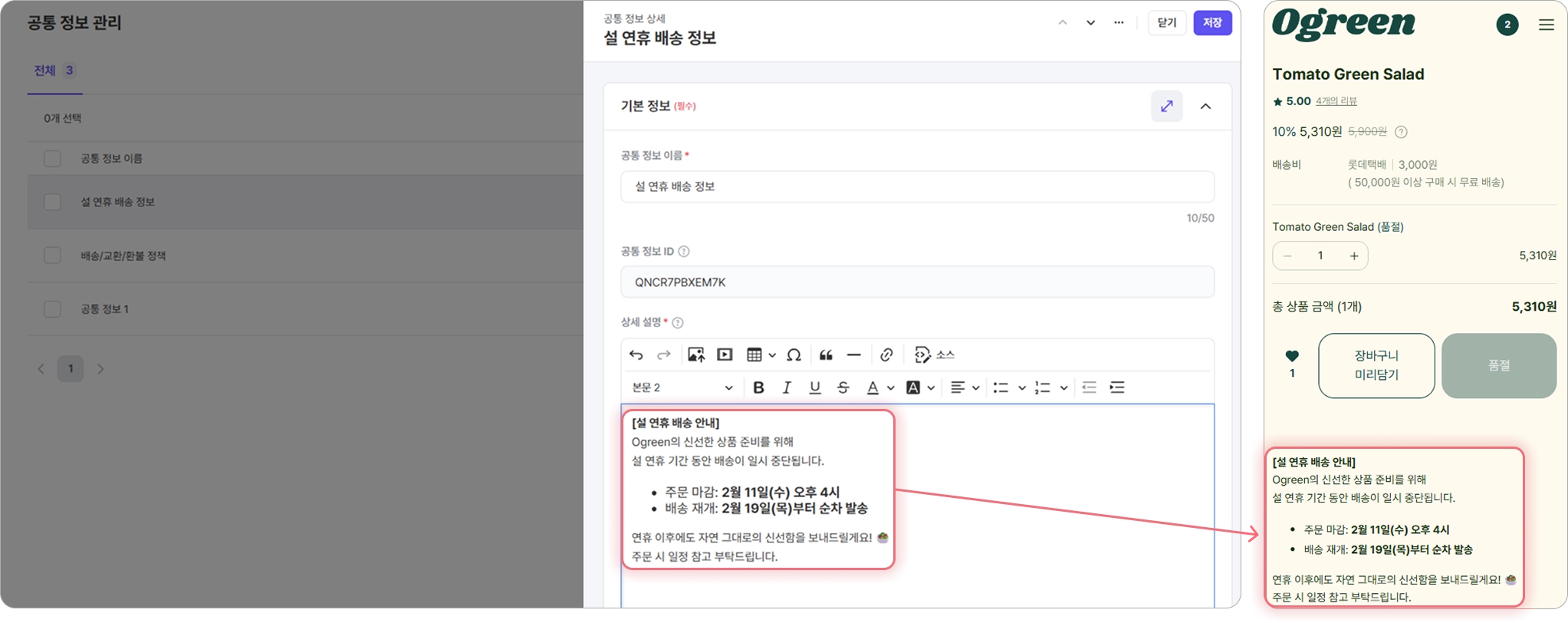 공지 사항을 ‘공통 정보’로 저장하여, 여러 상품에 일괄 노출하는 방법입니다.
