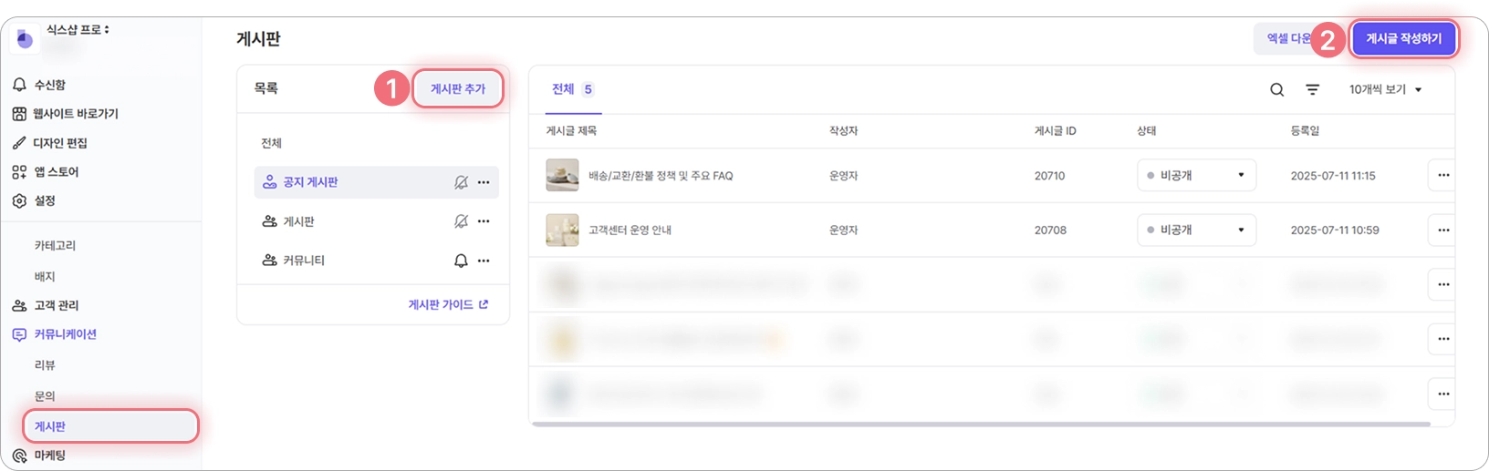 ① [커뮤니케이션 > 게시판]에서 게시판 추가 버튼으로 공지 게시판을 생성하고, 게시글 작성하기 버튼으로 공지 글을 작성합니다.