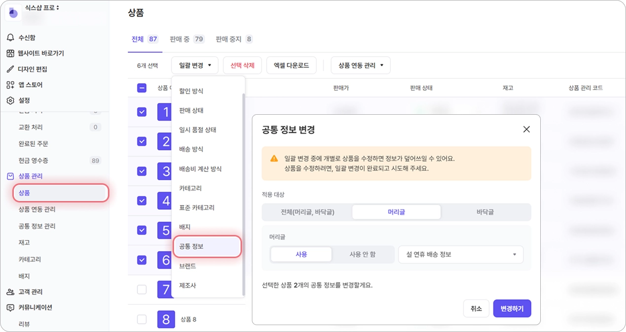 ② [상품 관리 > 상품]에서 공통 정보를 노출하려는 상품들을 모두 선택 후, 상단 ‘일괄 변경’ 기능으로 공통 정보를 전체 적용합니다.